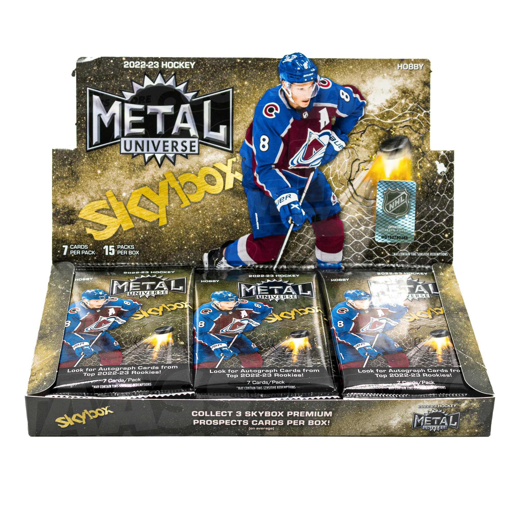 Eine originalverpackte (OVP) Sammelkarten Box von 2022/23 Upper Deck Skybox Metal Universe Hockey NHL Hobby Box mit 15 Packungen Per Box, 7 Karten Per Packung.