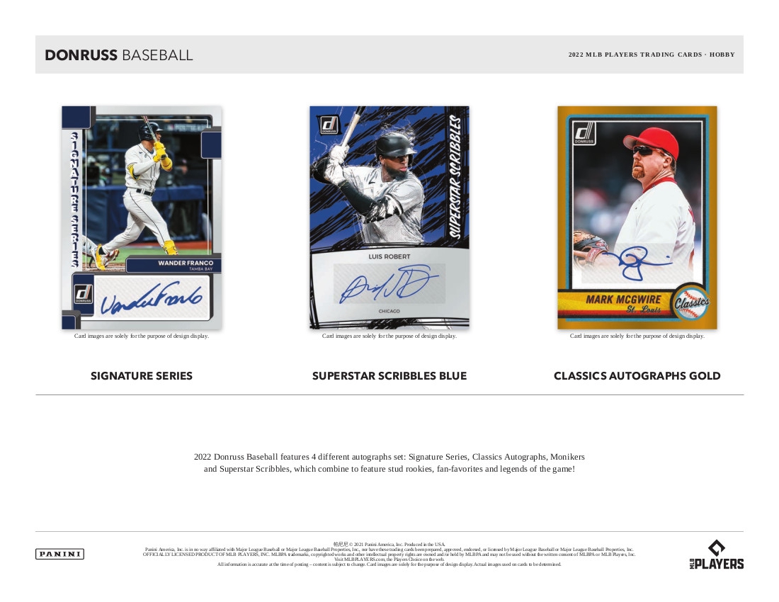 2022 Donruss Baseball bietet 4 verschiedene Autogramme: Signature Series, Classics Autographs, Monikers und Superstar Scribbles, die kombiniert werden, um Stud Rookies, Fanfavoriten und Legenden des Spiels zu präsentieren!