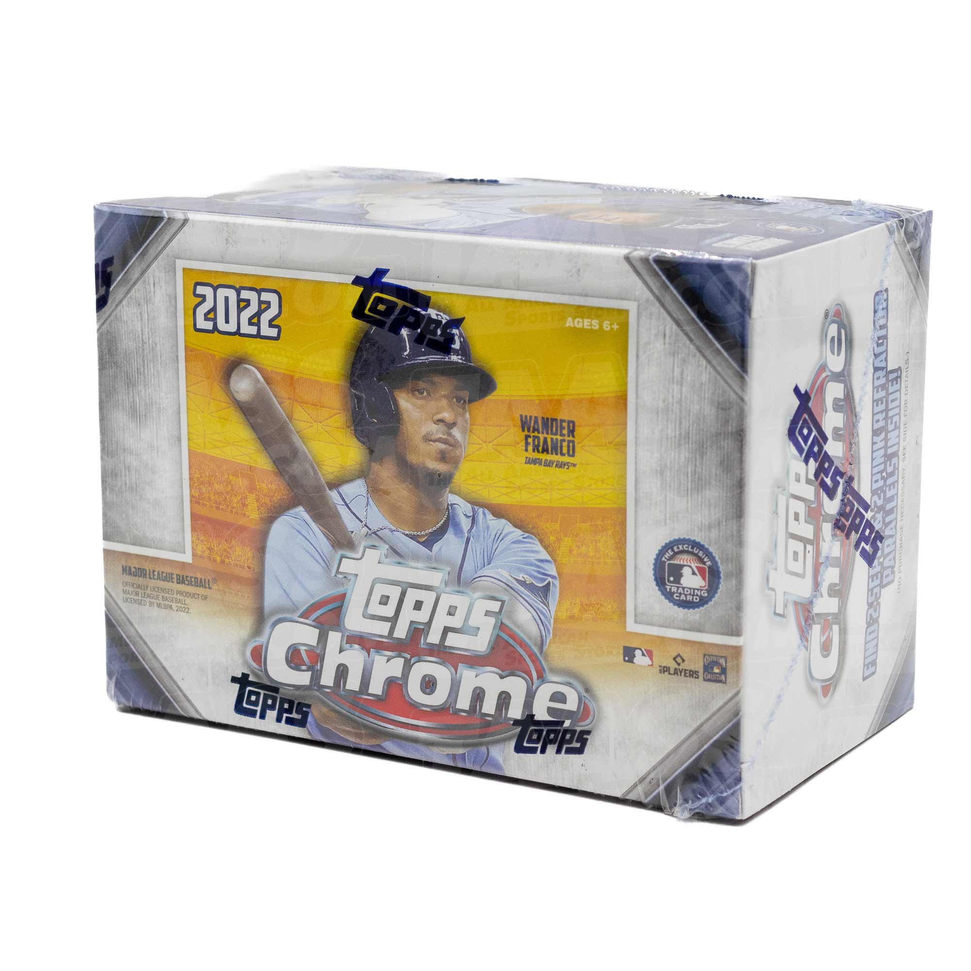 Eine originalverpackte (OVP) Sammelkarten Box von 2022 Topps Chrome Baseball MLB Blaster Box mit 8 Packungen Per Box, 4 Karten per Packung.