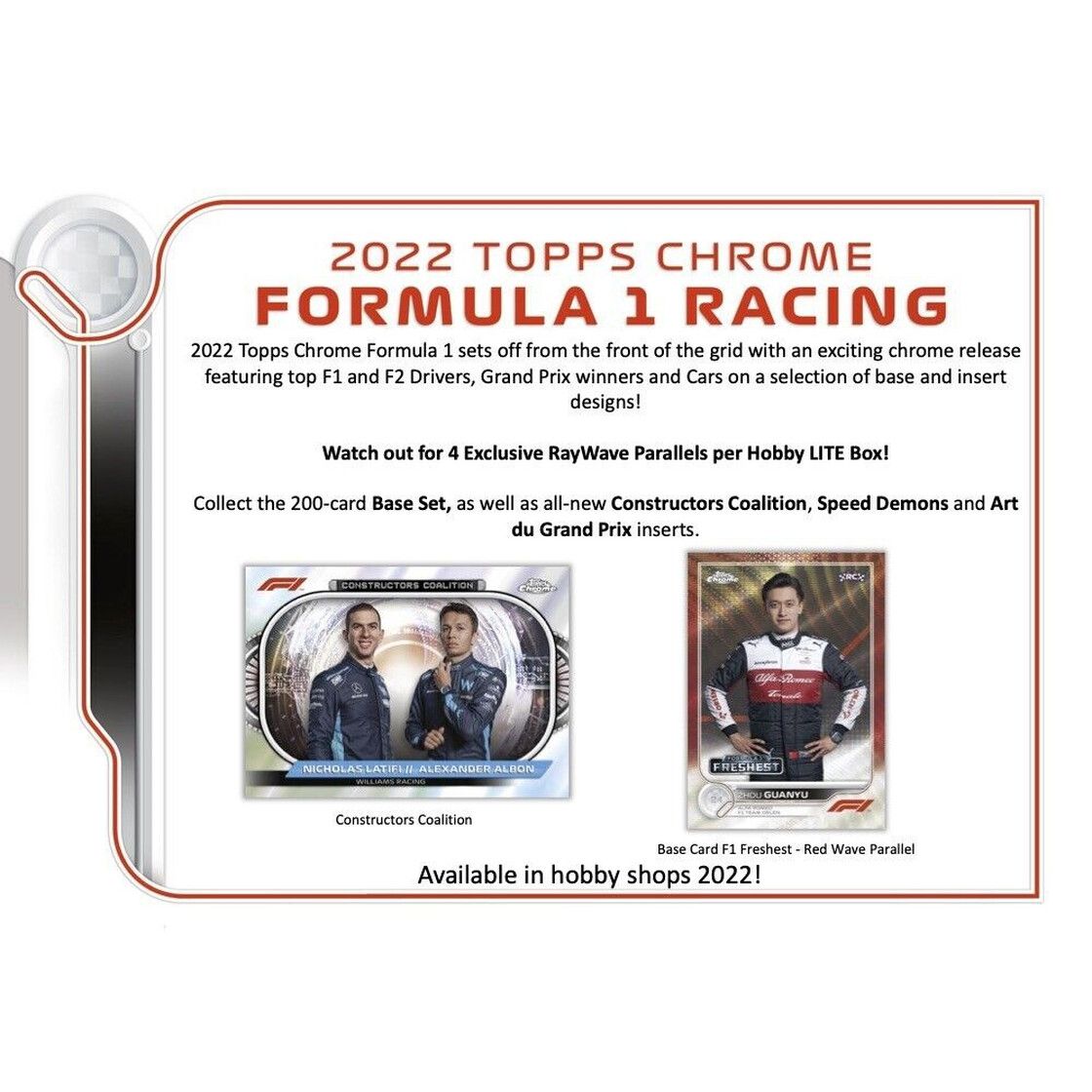 2022 Topps Chrome Formel 1 startet von der Spitze der Startaufstellung mit einer aufregenden Chromversion mit Top-F1- und F2-Fahrern, Grand-Prix-Gewinnern und Fahrzeuge von Basis- und Insert Designs.