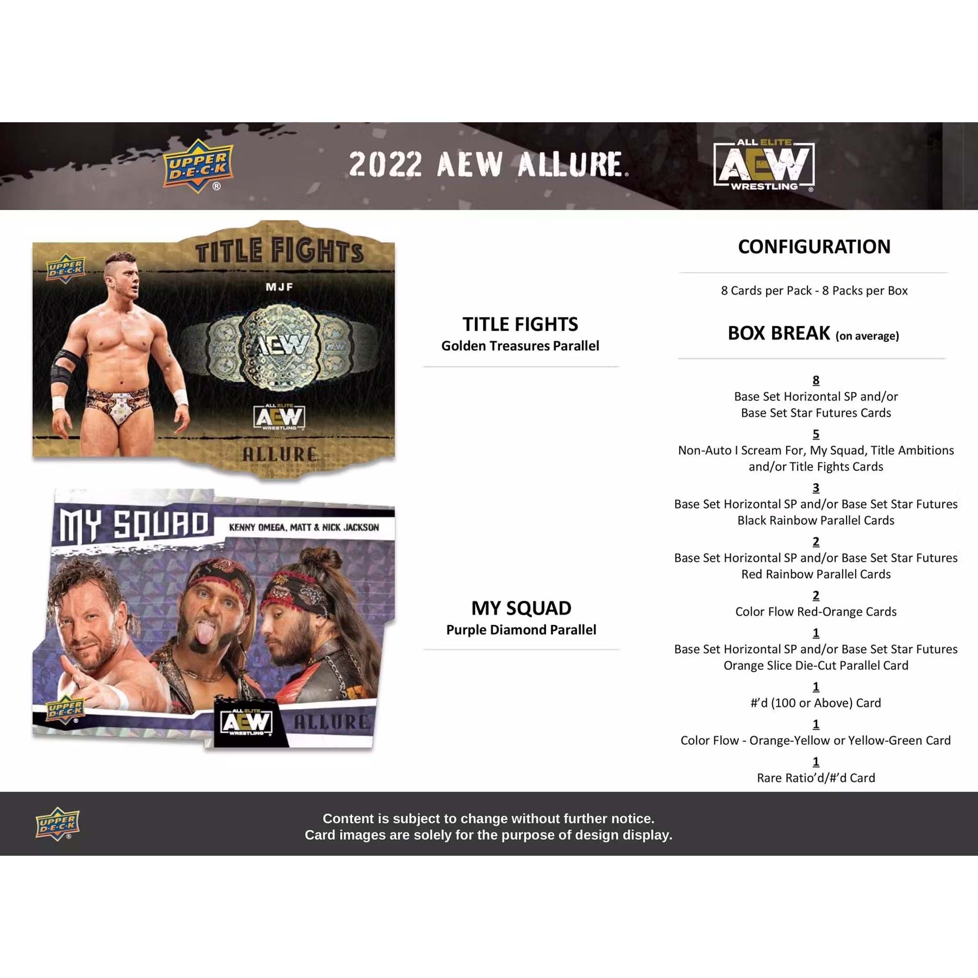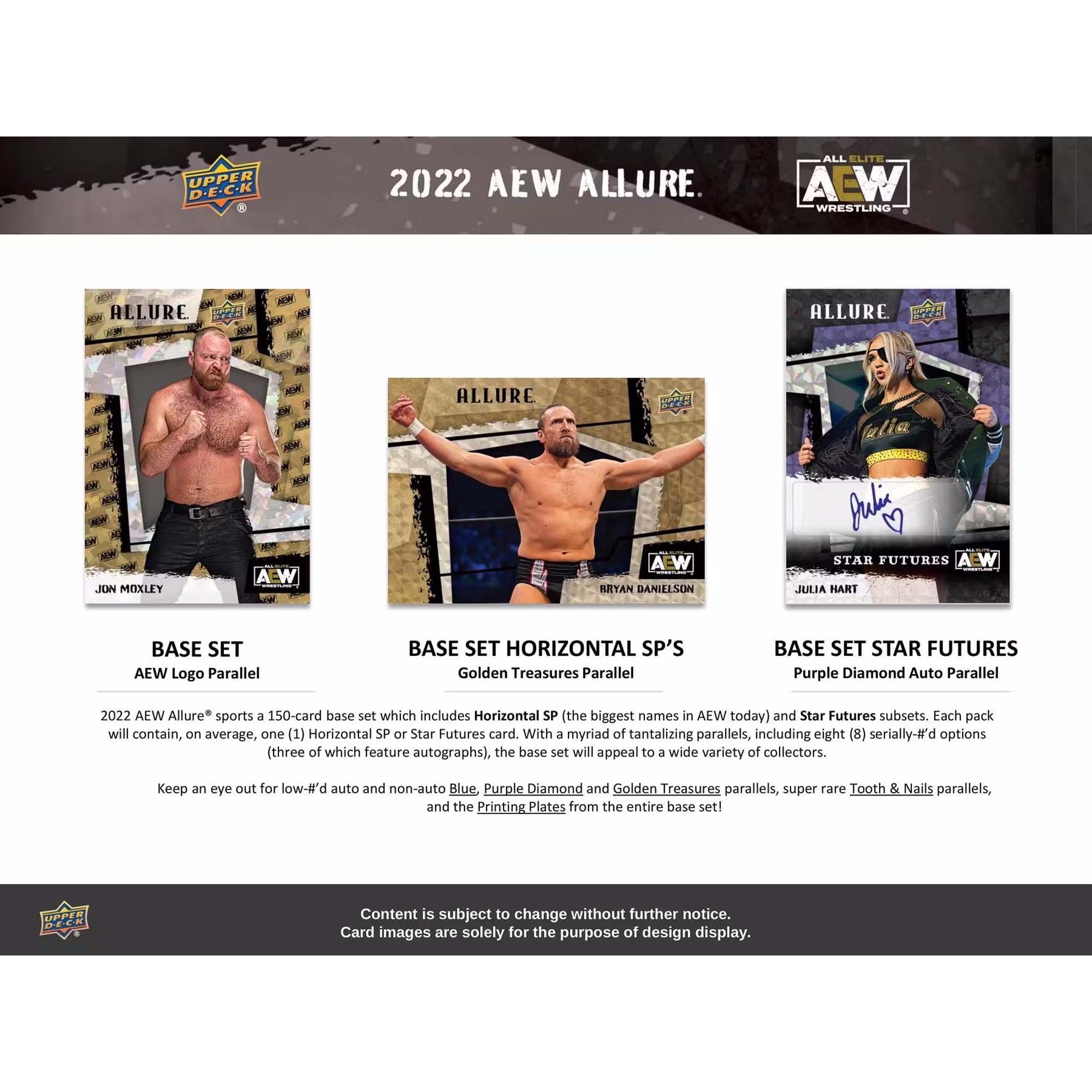 2022 AEW Allure bietet ein 150-Karten-Base-Set, das 25 Horizontal SP Karten (die größten Namen in AEW heute) und 25 Star Futures Karten umfasst. Im Durchschnitt enthält jede Packung eine (1) Horizontal SP oder Star Futures Karte. Mit einer Vielzahl verlockender Parallels, darunter acht (8) nummerierte Optionen (drei davon mit Autogrammen), wird das Base Set eine breite Palette von Sammlern ansprechen.