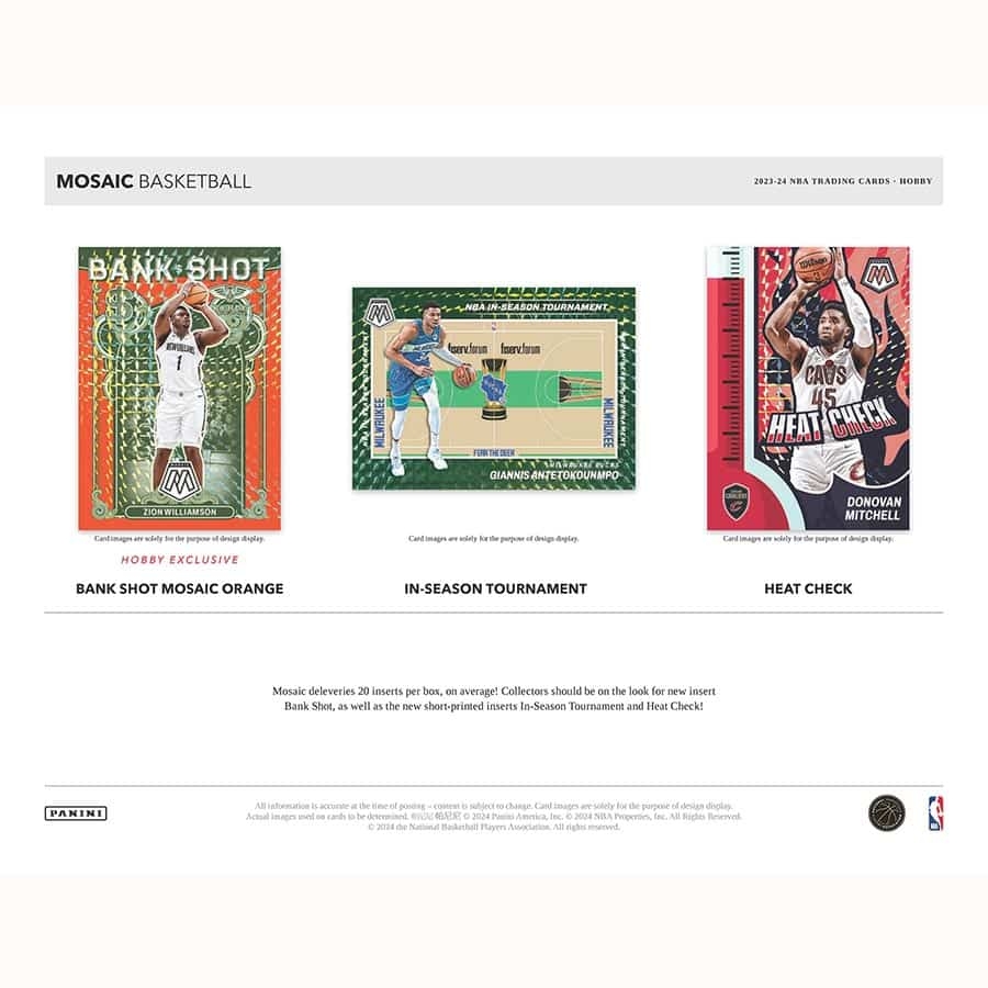 BANK SHOT / IN-SEASON TOURNAMENT / HEAT CHECK: Mosaic deleveries 20 inserts per box, on average! Collectors should be on the look for new insert Bank Shot, as well as the new short-printed inserts In-Season Tournament and Heat Check!