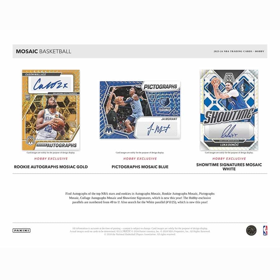 Finde Autogramme der Top-NBA-Stars und Rookies in Autographs Mosaic, Rookie Autographs Mosaic, Pictographs Mosaic, Collage Autographs Mosaic sowie Showtime Signatures, die dieses Jahr neu sind! Sammle exklusive Hobby-Parallels, die von 49 bis 1 nummeriert sind! Suche auch nach dem neuen Mosaic White Parallel (#'d /25), das dieses Jahr neu ist!