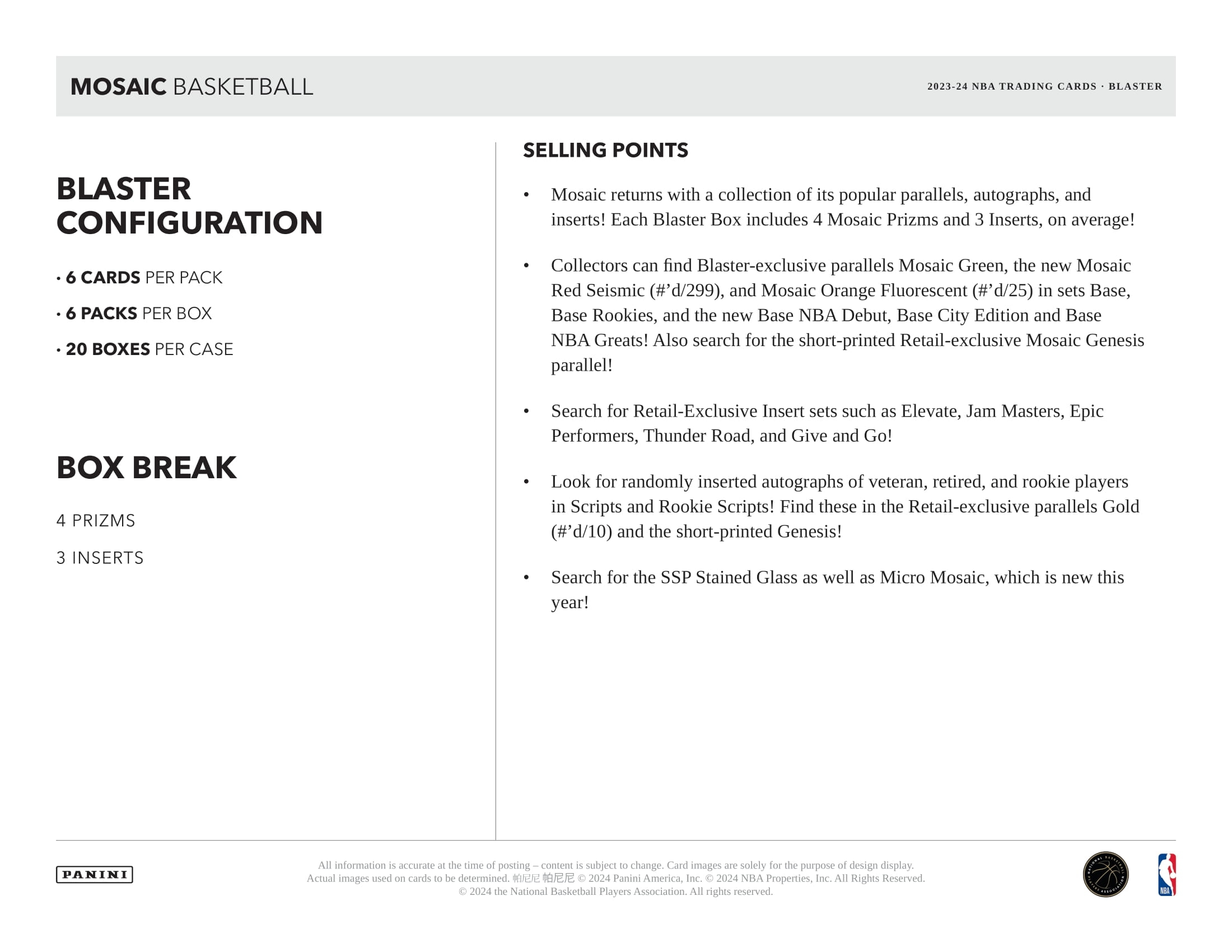 Sammler können exklusive Blaster-Parallels wie Mosaic Green, das neue Mosaic Red Seismic (#'d/299) und Mosaic Orange Fluorescent (#'d/25) in den Sets Base, Base Rookies sowie den neuen Base NBA Debut, Base City Edition und Base NBA Greats finden! Halte auch Ausschau nach dem seltenen, Retail-exklusiven Mosaic Genesis Parallel!