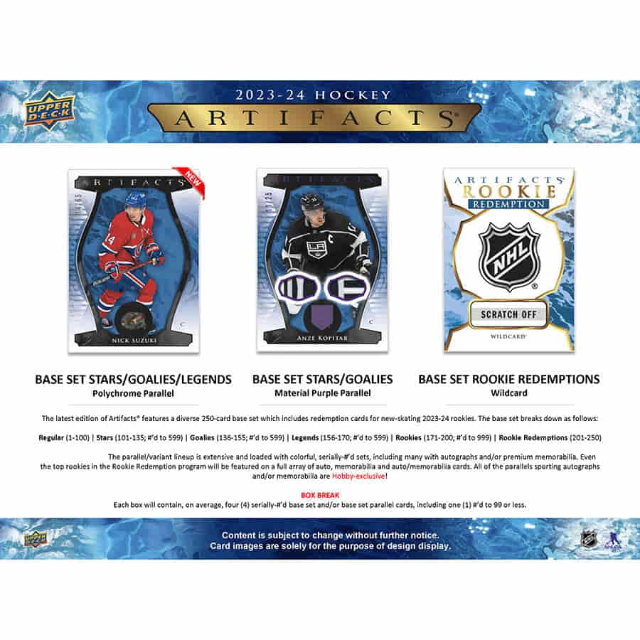 Das neueste Artifacts enthält ein vielfältiges 250-Karten-Basis-Set, das auch Einlösekarten für die neuen Eishockey-Rookies der Saison 2023-24 enthält. Das Basis-Set ist wie folgt aufgeteilt (Änderungen vorbehalten):