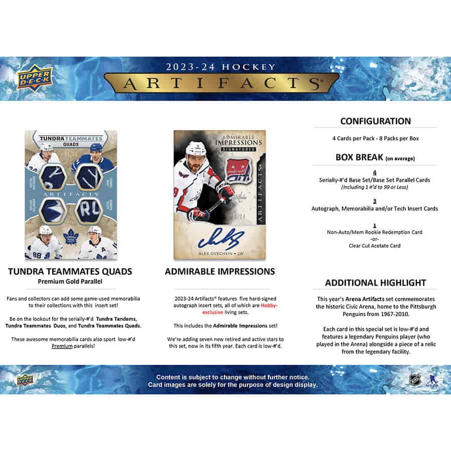 Das diesjährige Arena Artifacts-Set würdigt die historische Civic Arena, die von 1967 bis 2010 die Heimat der Pittsburgh Penguins war. Jede Karte in diesem speziellen Set, nummeriert bis 67, zeigt einen legendären Penguins-Spieler (der in der Arena gespielt hat) neben einem Stück Relikt aus der legendären Einrichtung.