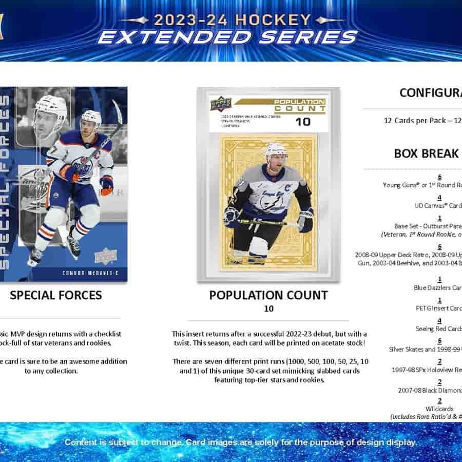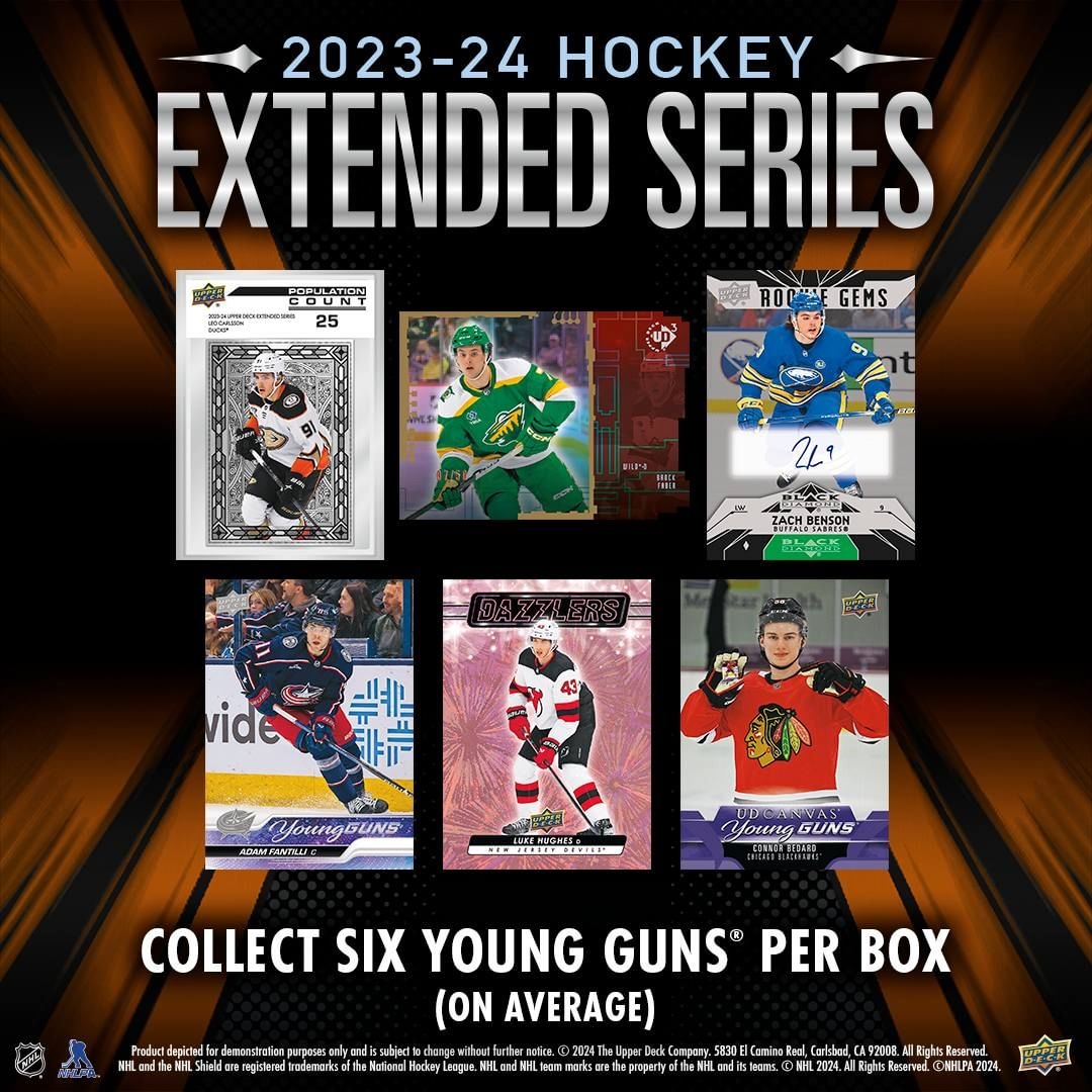 Die Extended Series liefert die letzten 250 Karten: 200 Veteranen und 50 Young Guns/1st Round Rookies (2023-24 Rookies, die in der ersten Runde ausgewählt wurden). Jede Box enthält im Durchschnitt sechs Young Guns/1st Round Rookies Karten.