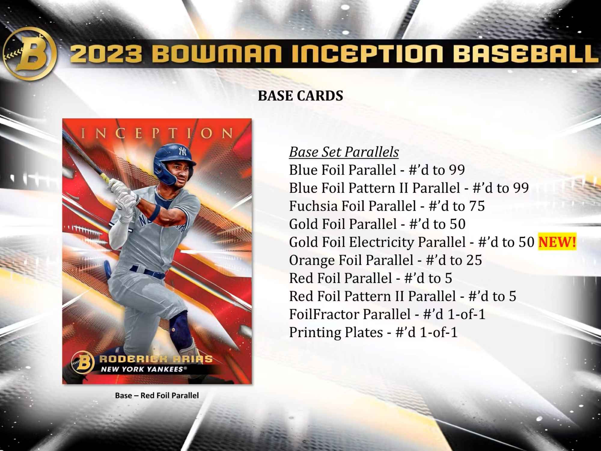 Sammle das gesamte 100-Karten-Basis-Set und achte auf den "Inception Inaugurations" Goldfolien-Stempel, der das erste Mal eines Spielers in Inception kennzeichnet.