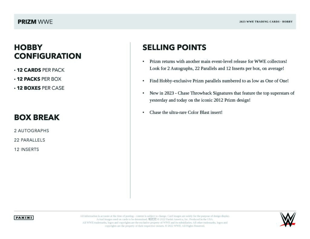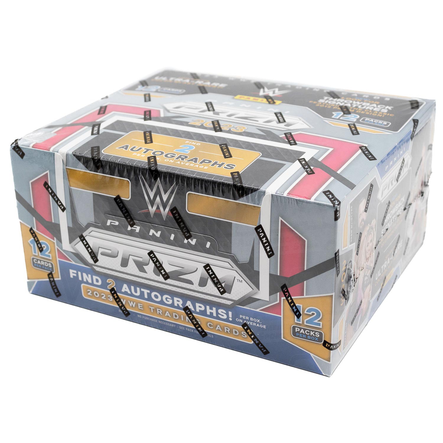 Eine originalverpackte (OVP) Sammelkarten Box von 2023 Panini Prizm WWE Wrestling Hobby Box mit 12 Packungen Per Box, 12 Karten per Packung.