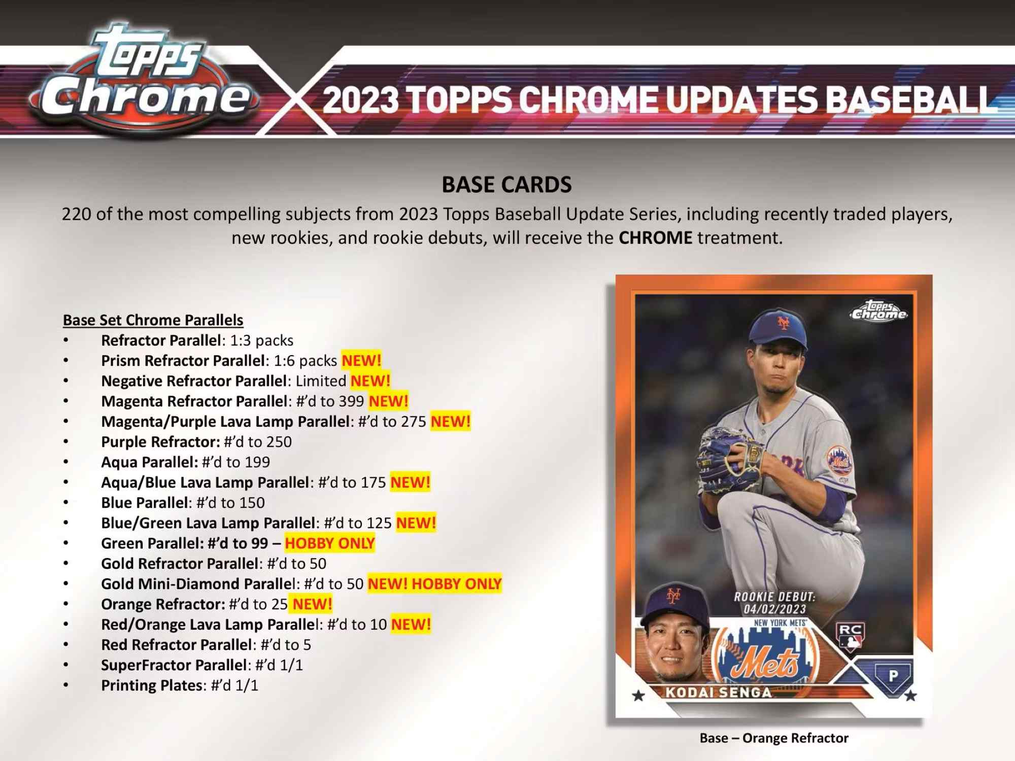 BASE CARDS: 220 of the most compelling subjects from 2023 Topps Baseball Update Series, including recently traded players, new rookies and rookie debuts, will receive the CHROME treatment.