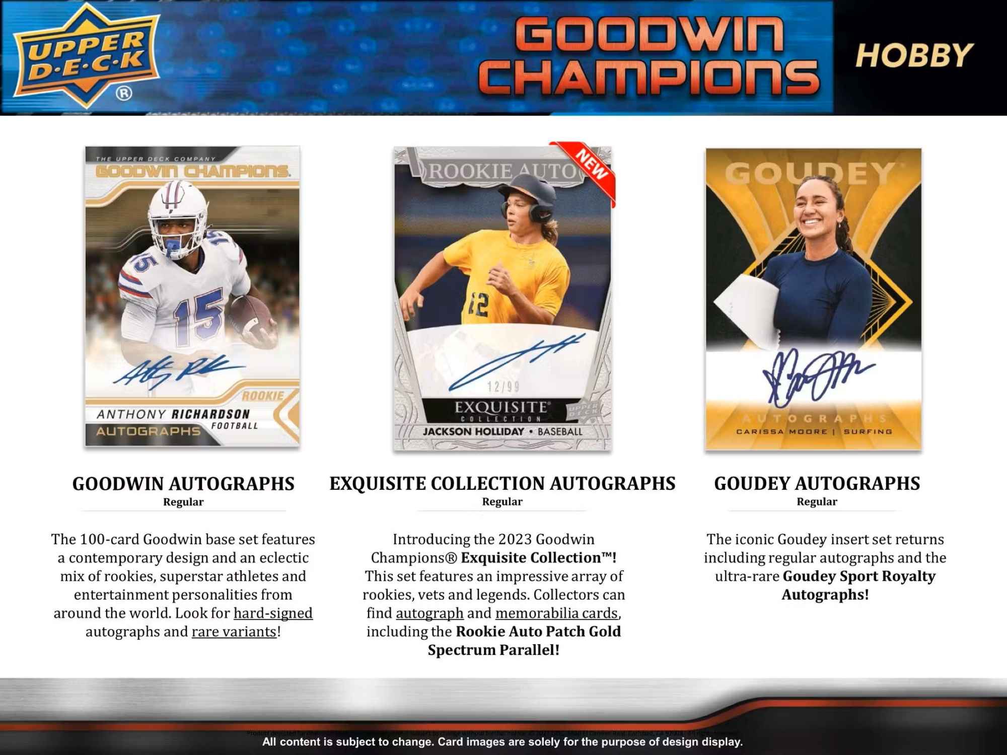 Wir stellen die Goodwin Champions Exquisite Collection 2023 vor! Dieses Set enthält eine beeindruckende Auswahl an Rookies, Veteranen und Legenden. Sammler können Autogramm- und Memorabiliakarten finden, darunter den Rookie Auto Patch Gold Spectrum Parallel!