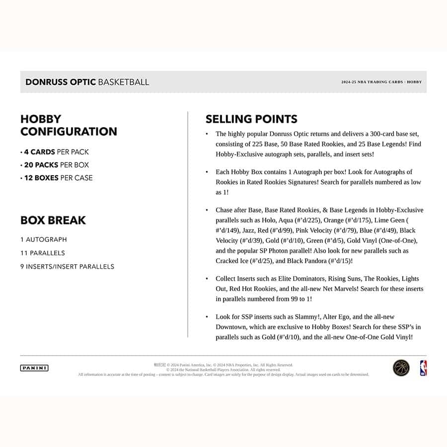Die 2024-25 Donruss Optic Basketball Hobby Box liefert dir ein umfangreiches 300-Card Base Set, bestehend aus: