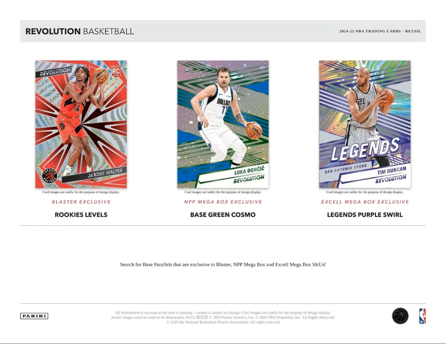 NPP Mega Box Exclusive: Base Blue Storm, Rookies Blue Storm, Legends Blue Storm, Base Blue Cosmo (#'d/249), Rookies Blue Cosmo (#'d/249), Legends Blue Cosmo (#'d/249), Base Green Storm (#'d/149), Rookies Green Storm (#'d/149), Legends Green Storm (#'d/149), Base Green Cosmo (#'d/75), Rookies Green Cosmo (#'d/75), Legends Green Cosmo (#'d/75), Base Pink Storm (#'d/20), Rookies Pink Storm (#'d/20), Legends Pink Storm (#'d/20), Revolution Signatures Cosmo (#'d/35), Vortex Blue Cosmo (#'d/249), New Wave Blue Cosmo (#'d/249), Star Gazing Blue Cosmo (#'d/249), Hardwood Legacy Blue Cosmo (#'d/249), Vortex Green Storm (#'d/75), New Wave Green Storm (#'d/75), Star Gazing Green Storm (#'d/75), Hardwood Legacy Green Storm (#'d/75).