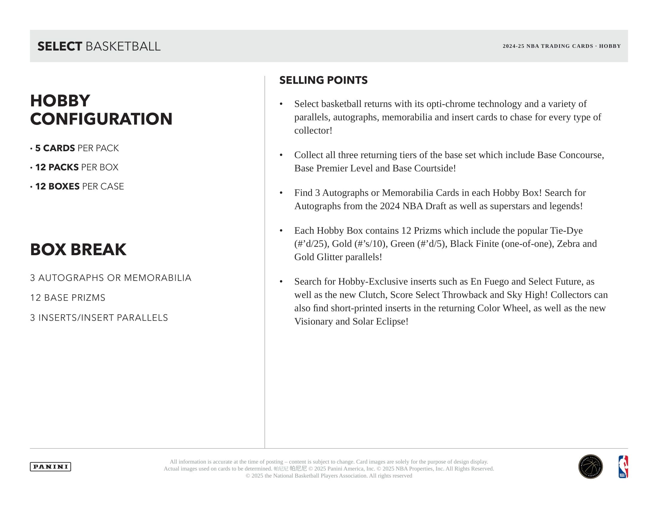 Ein absolutes Muss für Fans von hochwertigen NBA-Sammelkarten - Select Basketball Hobby 2024-25 kombiniert Rookie-Jagd mit Premium-Designs und Autogrammen der größten Namen des Spiels!