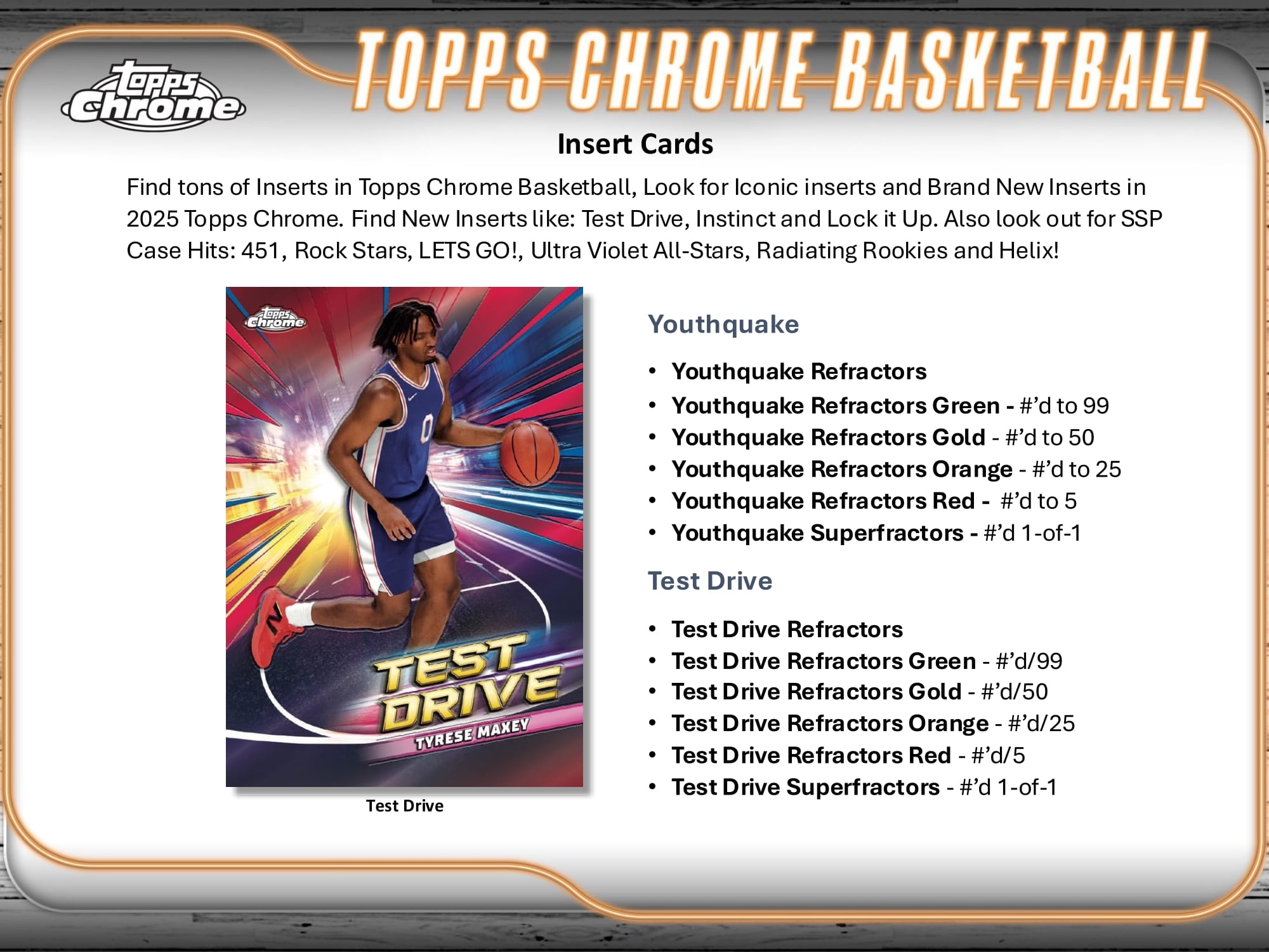 Neben zahlreichen Refractor-Parallels und Autogrammen bietet die Hobby Box auch viele neue Insert-Sets - darunter Test Drive, Instinct und Lock it Up. Außerdem warten spektakuläre SSP Case Hits: 451, Rock Stars, LETS GO!, Ultra Violet All-Stars, Radiating Rookies und Helix!
