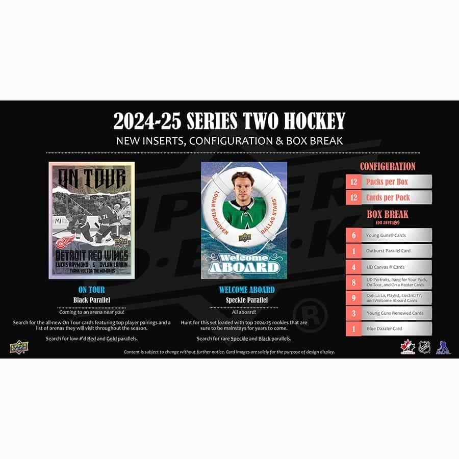 Series 2 umfasst die nächsten 250 Karten des 2024-25 Upper Deck Basisset, das jährlich als das am meisten gesammelte Basisset im Hockey gilt. Das Set beinhaltet 198 Veteranenkarten, 49 Young Guns (die meist erwarteten Rookie-Karten der Saison!) und 3 Checklisten.