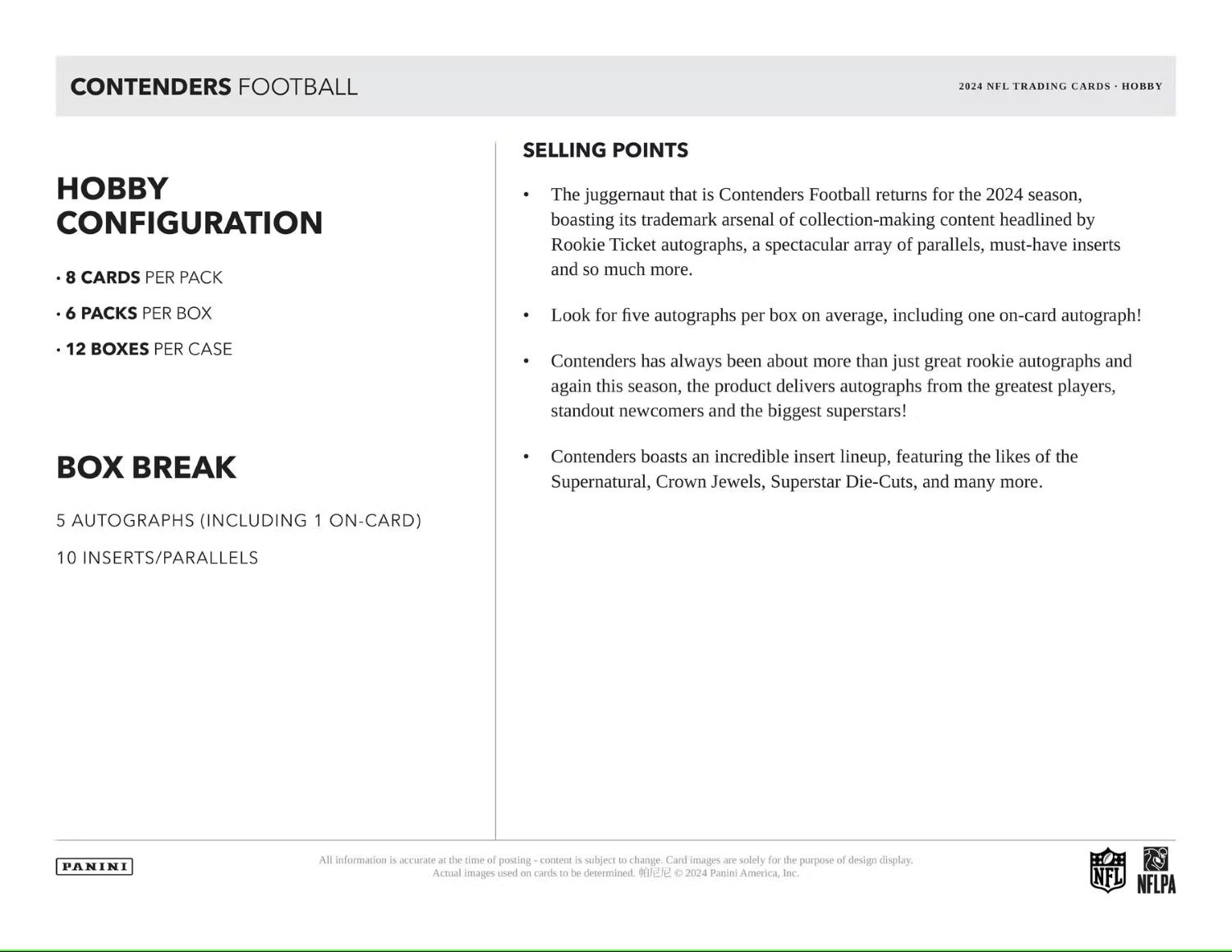 Contenders Football ist der absolute Renner und kehrt für die Saison 2024 zurück - mit seinem einzigartigen Arsenal an Sammlerstücken, allen voran Rookie-Ticket-Autogrammen, einer spektakulären Auswahl an Parallelen, unverzichtbaren Inserts und vielem mehr.