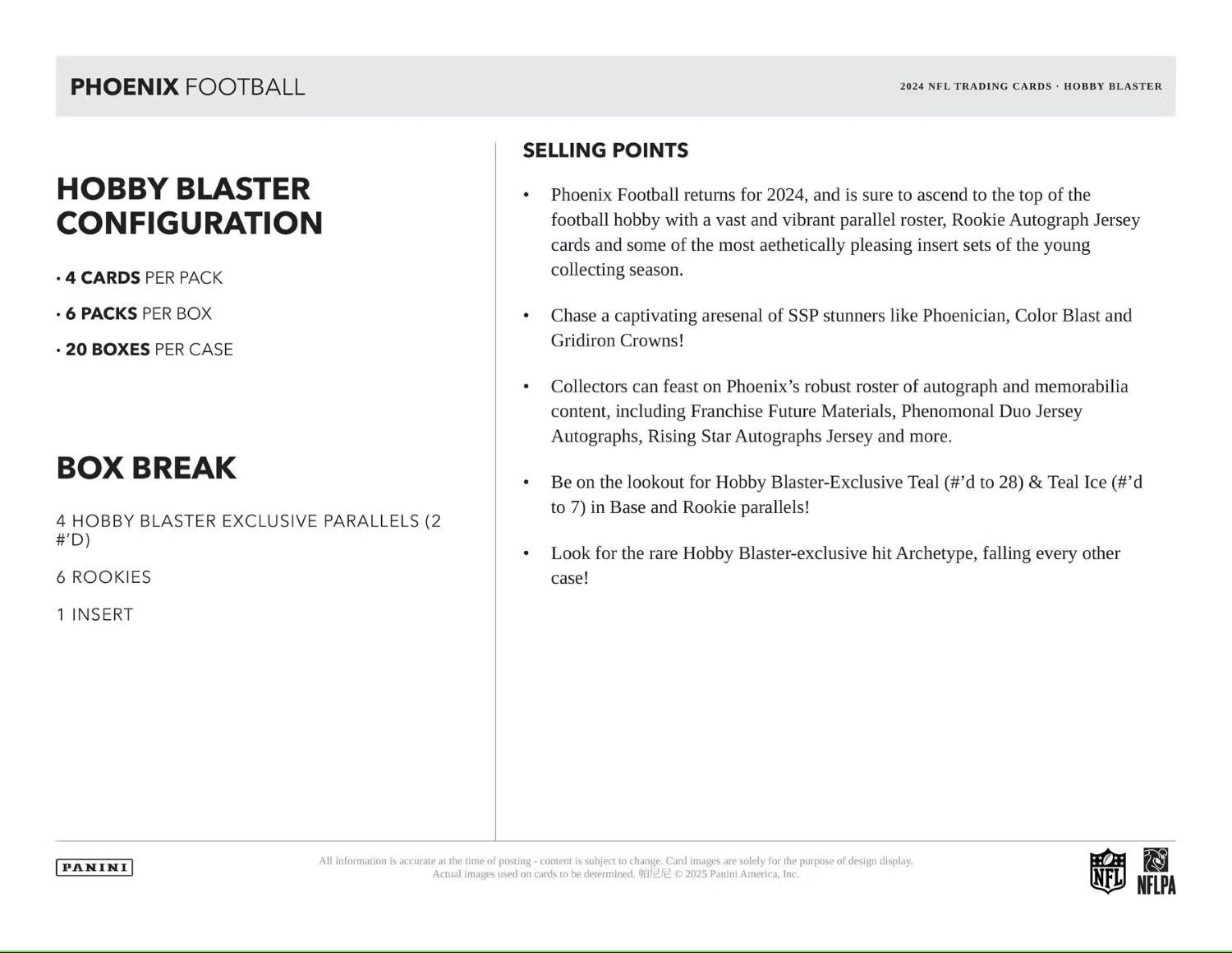Phoenix Football kehrt 2024 zurück und wird mit Sicherheit die Spitze des Football-Hobbys erobern - mit einem umfangreichen und lebendigen Parallel-Kader, Rookie-Autogramm-Jersey Cards und einigen der ästhetisch ansprechendsten Inserts der jungen Sammelsaison.