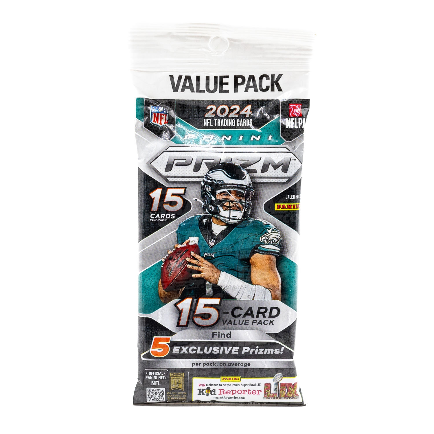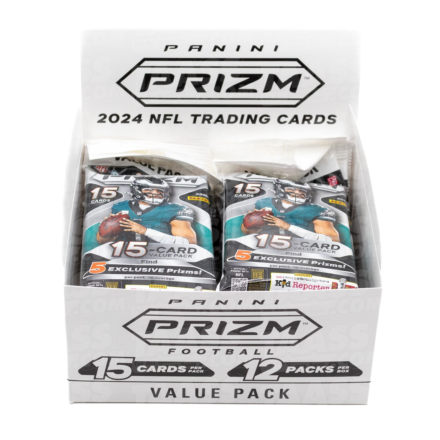 Eine Sammelkarten 2024 Panini Prizm NFL Football Value Fat-Pack Box mit 12 Packungen per Box, 15 Karten per Packung.