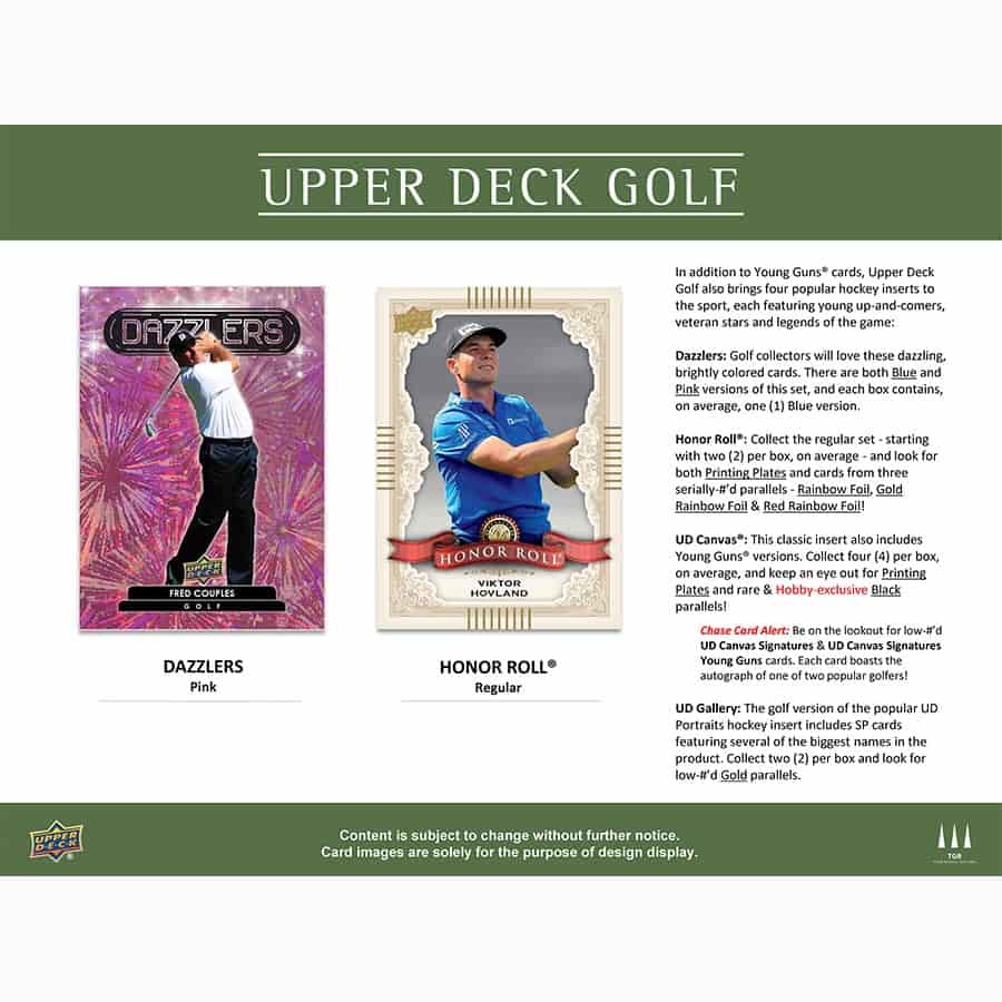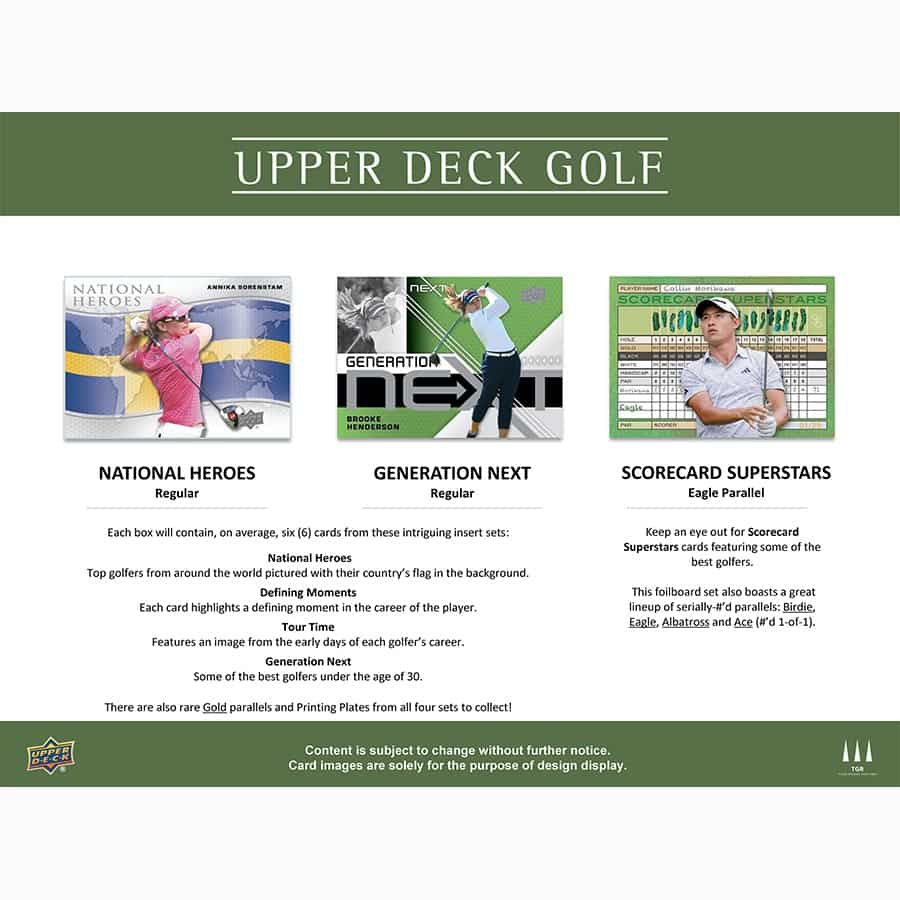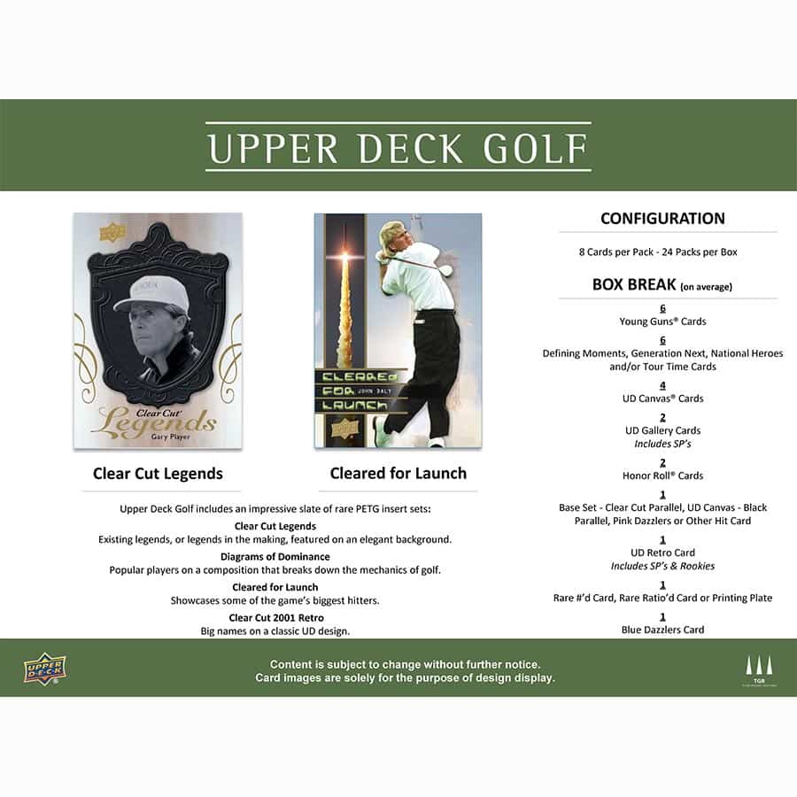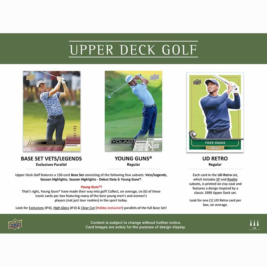 Upper Deck Golf enthält ein 150-Karten-Grundset, bestehend aus den folgenden vier Unterkategorien: Vets/Legends, Saison-Highlights, Saison-Highlights - Debüt-Datum & Young Guns.