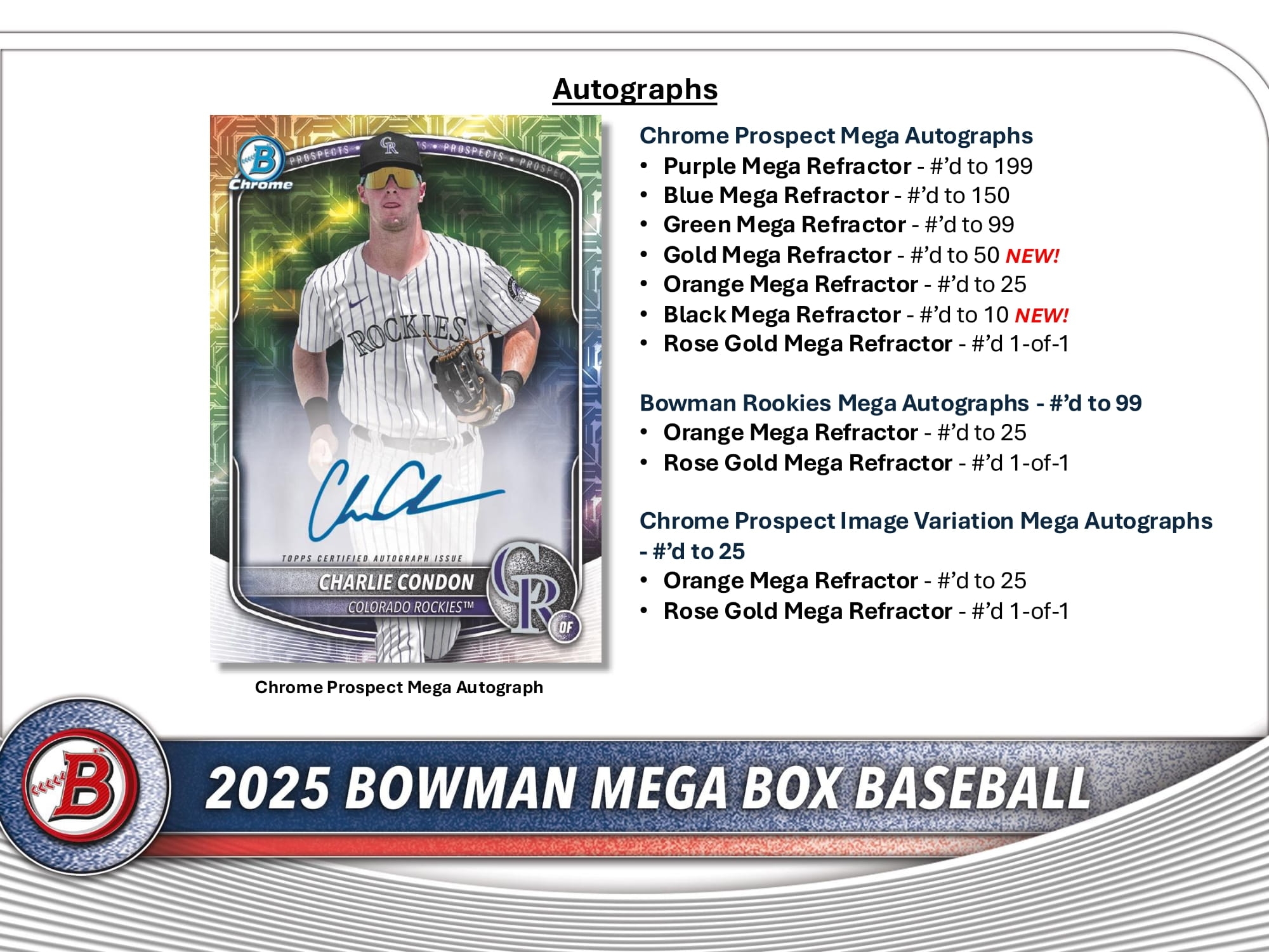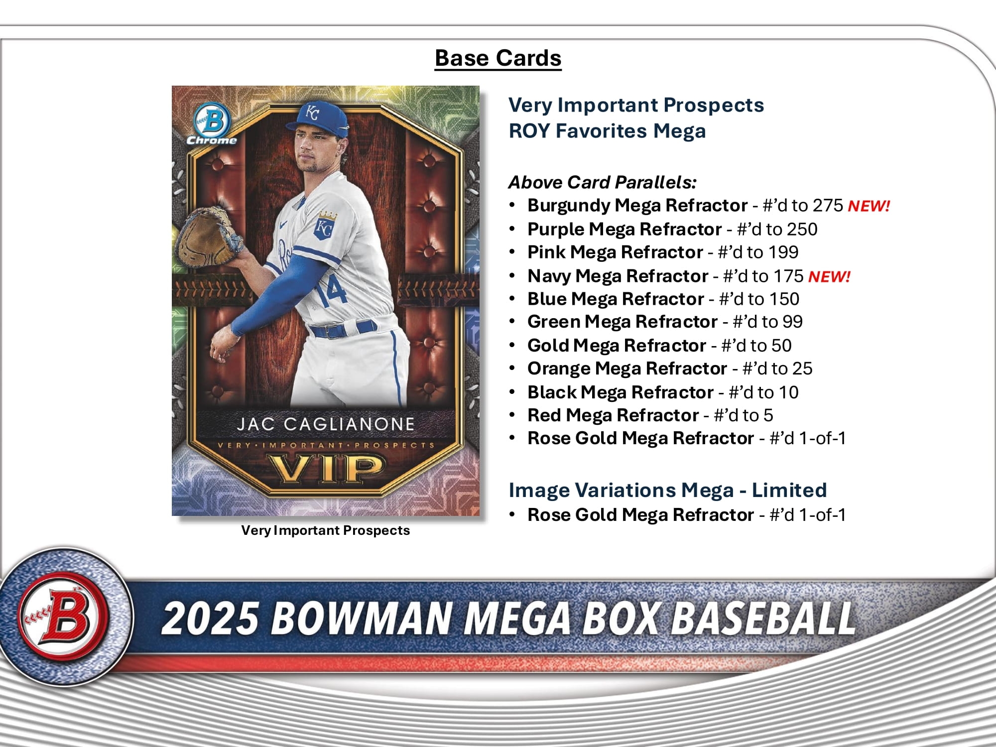 Enthält die Top 100 Karten aus dem 2024 Bowman Set - 50 Base + 50 Chrome Prospects - jetzt im Mega Chrome Design!