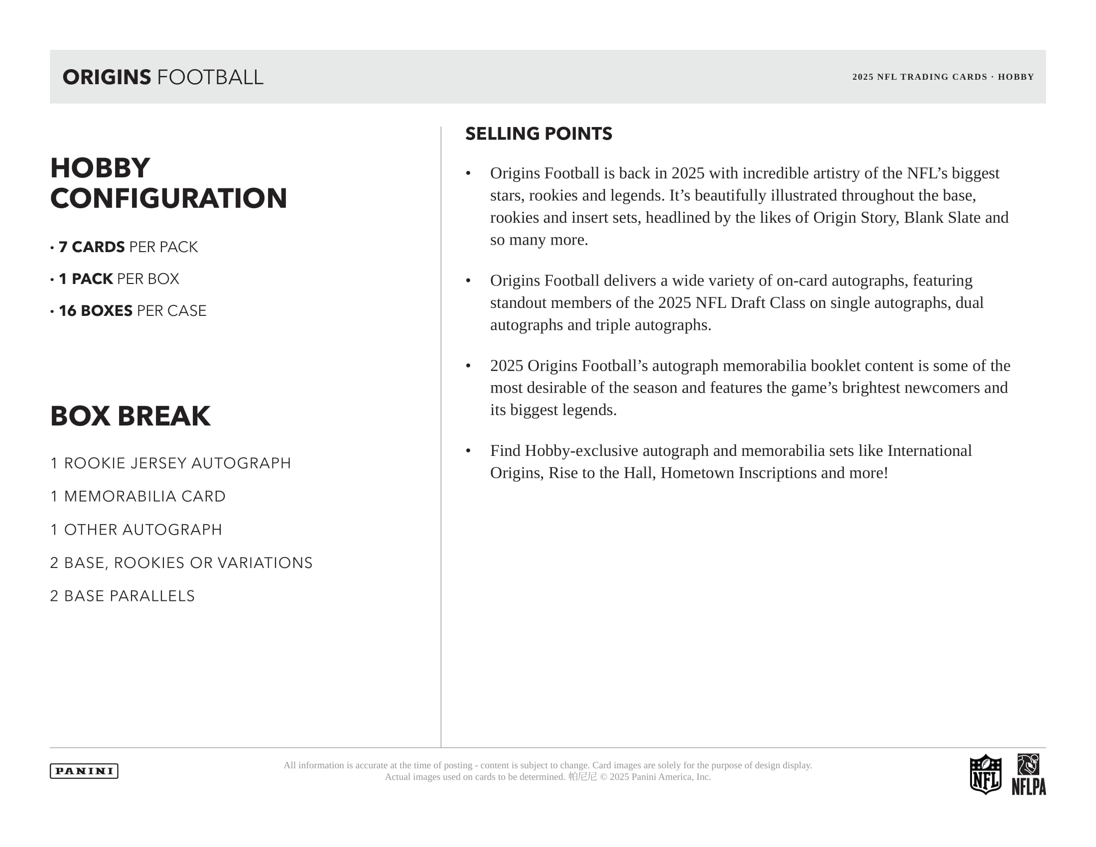 Origins Football kehrt zurück - und bringt auch 2025 wieder die beeindruckende Mischung aus künstlerischem Design und starken Autogrammen mit! Die Serie verbindet moderne NFL-Rookies, aktuelle Superstars und absolute Legenden in einem visuell einzigartigen Set.