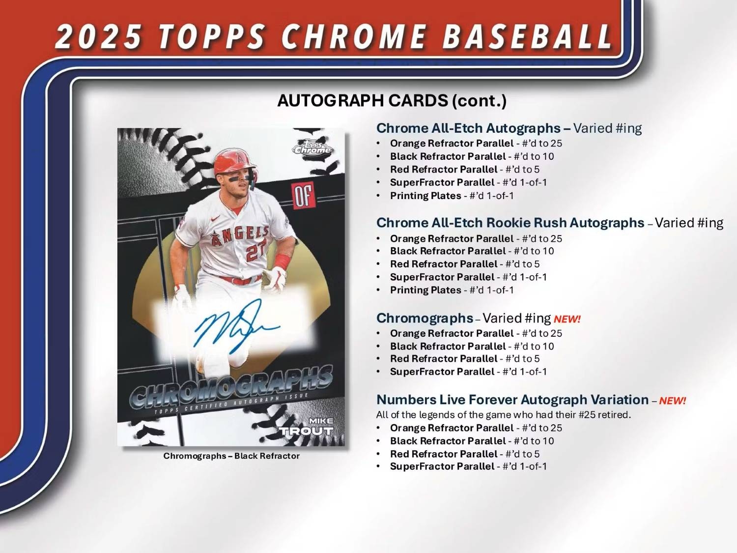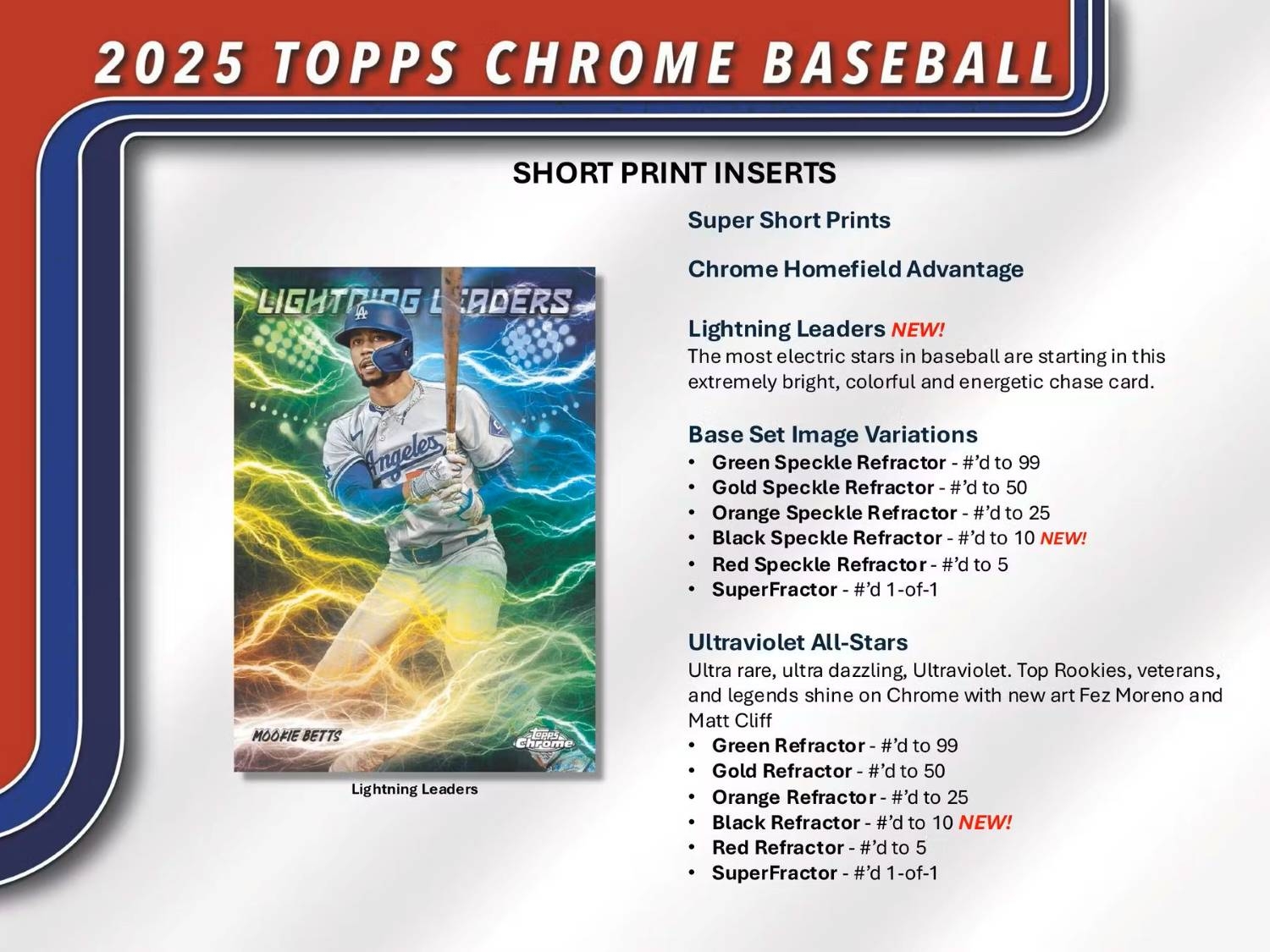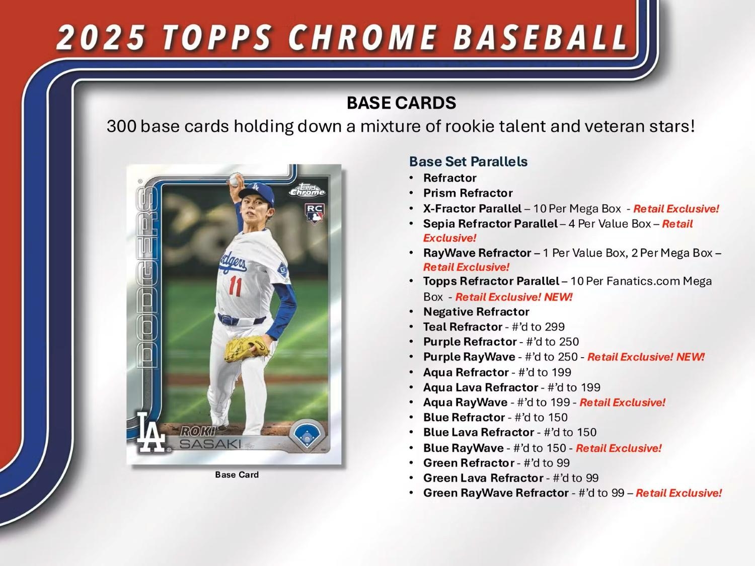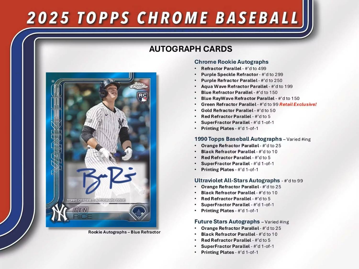 2025 Topps Chrome Baseball bietet alles! Erlebe eine spannende Mischung aus atemberaubenden Inserts und aufregenden Chrom-Parallelen sowie Autogrammkarten einiger der elektrisierendsten Nachwuchstalente der Baseballgeschichte!