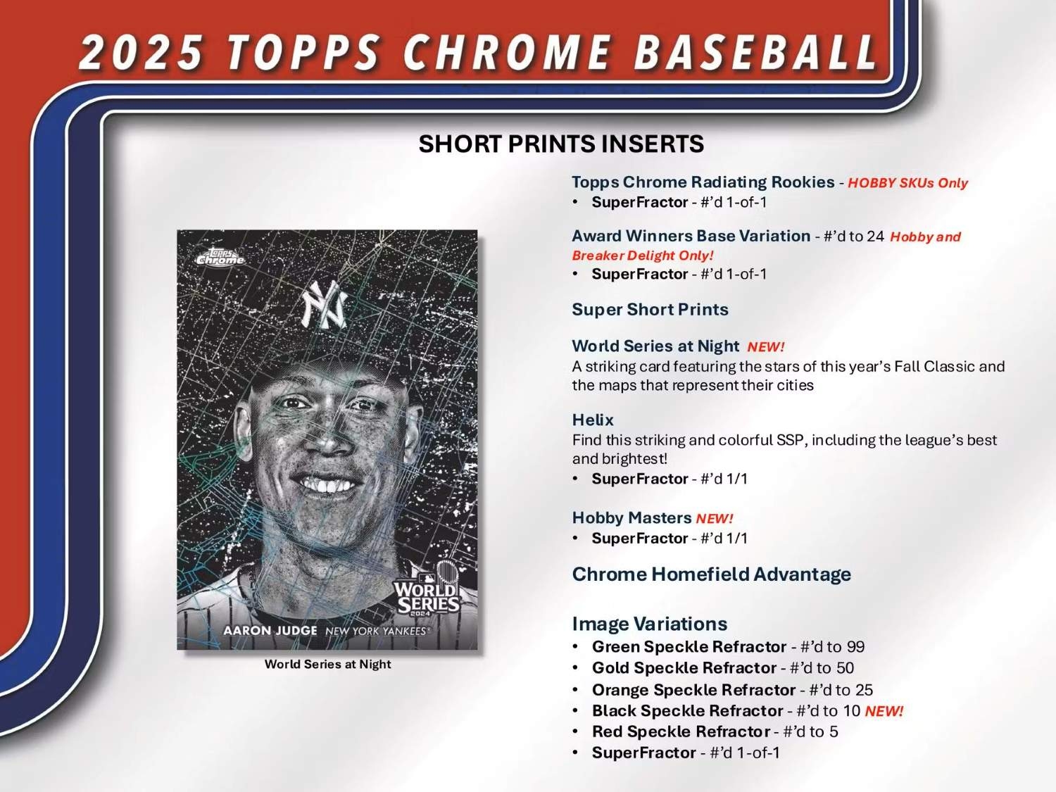 2025 Topps Chrome Baseball bietet alles! Erlebe eine spannende Mischung aus atemberaubenden Inserts und aufregenden Chrom-Parallelen sowie Autogrammkarten einiger der elektrisierendsten Nachwuchstalente der Baseballgeschichte!