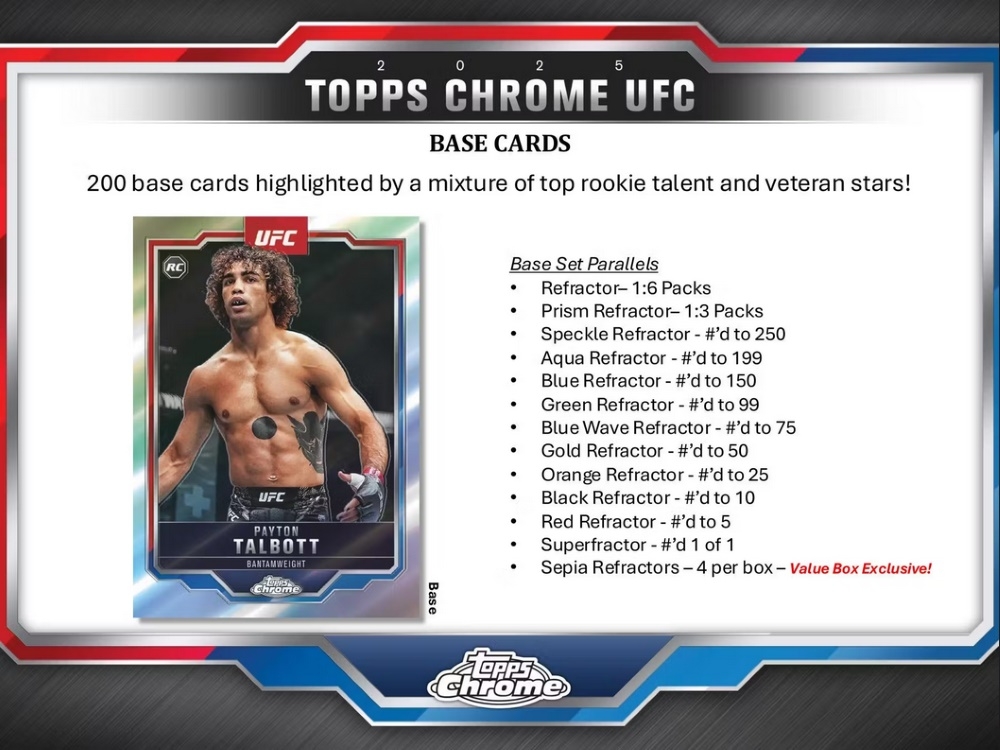 Sammle das komplette 200-Karten starke Base Set mit UFC-Stars aus Vergangenheit, Gegenwart und Zukunft - natürlich auf edlem Chrome-Design und in einer Vielzahl von farbenfrohen Parallels!