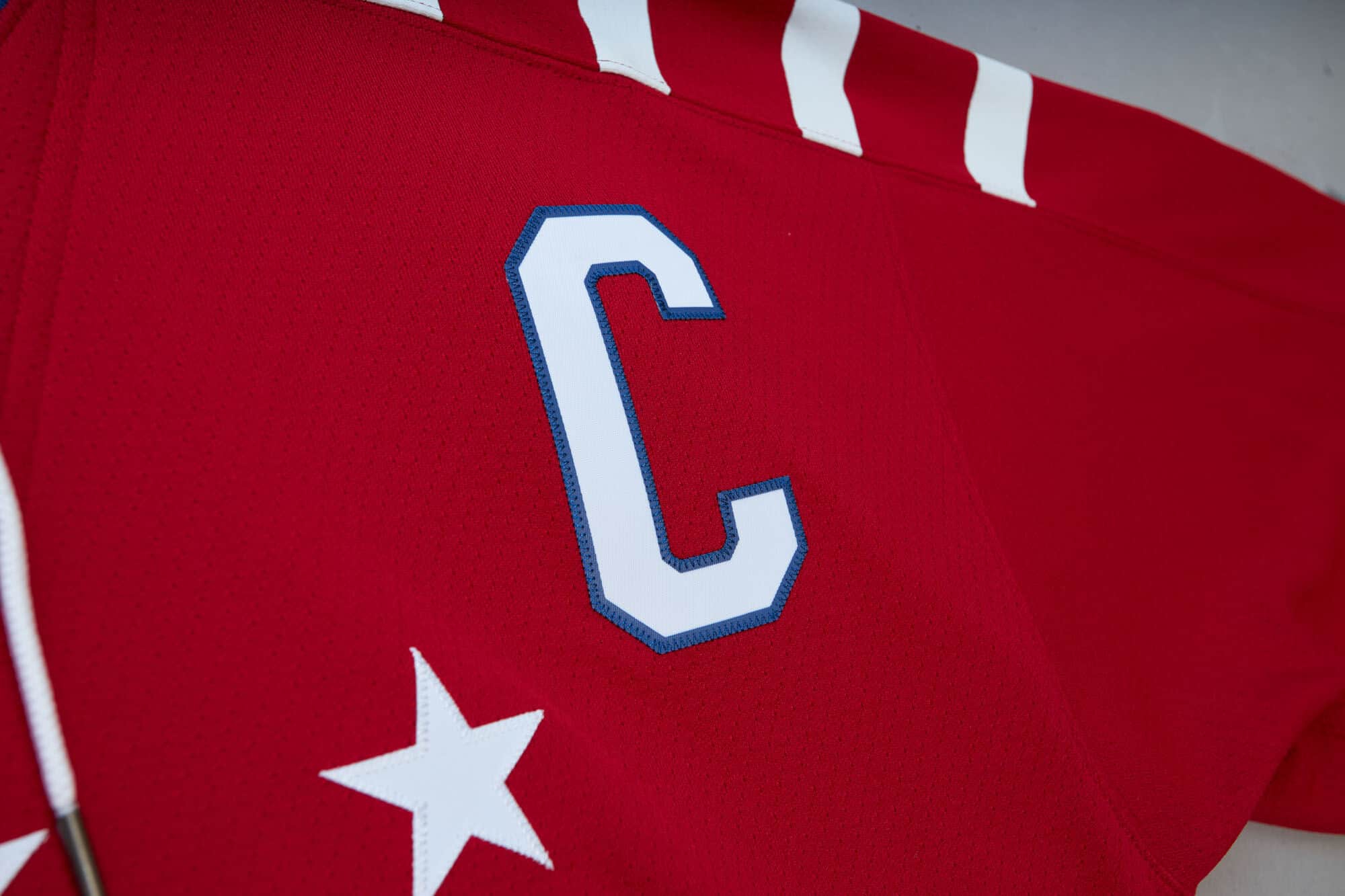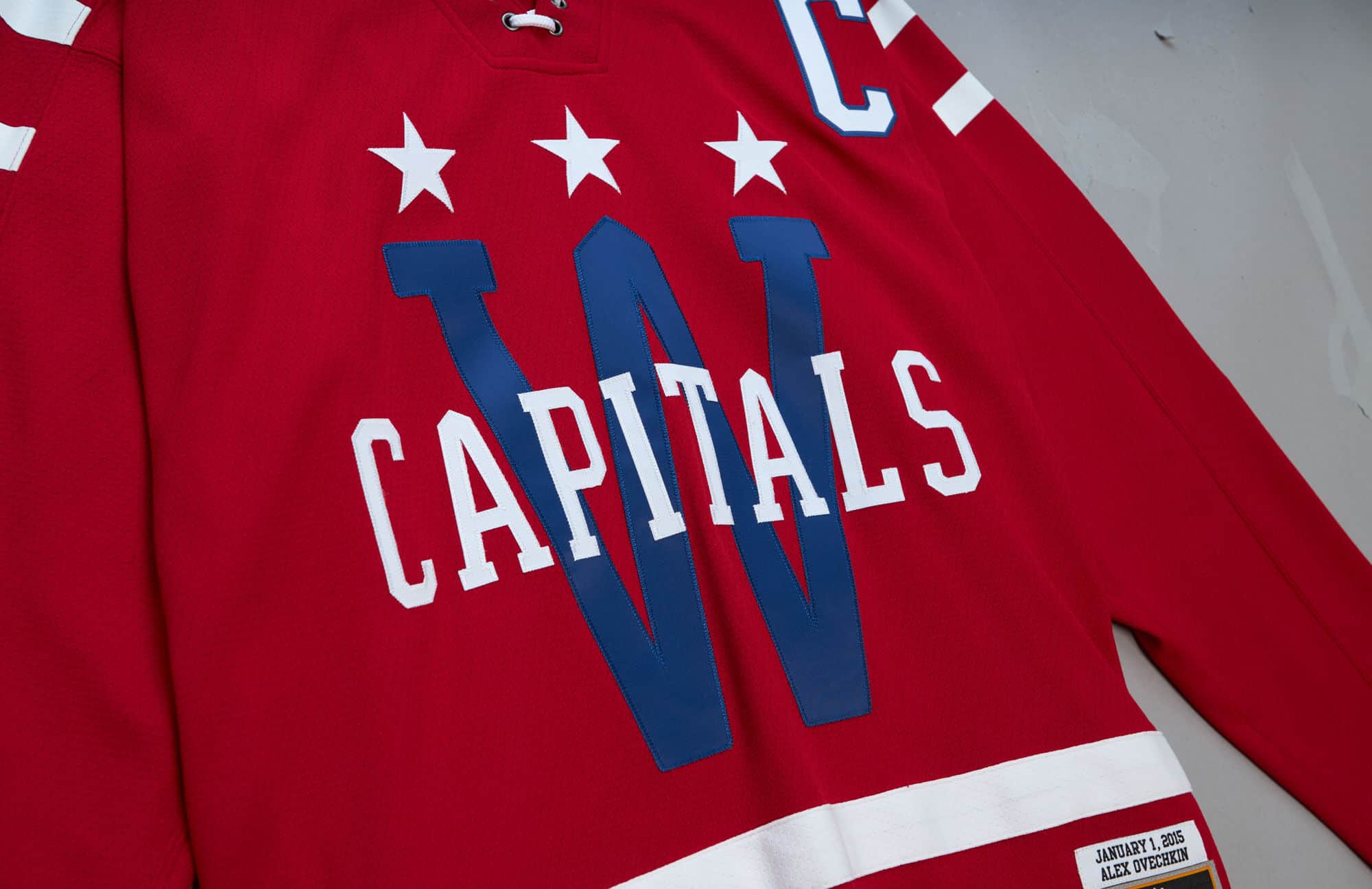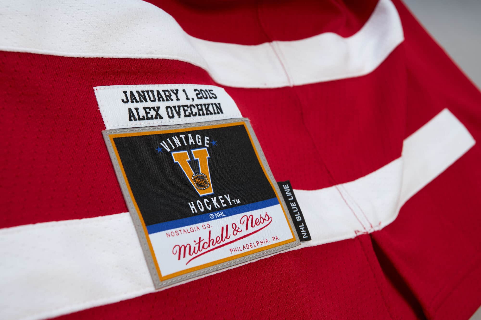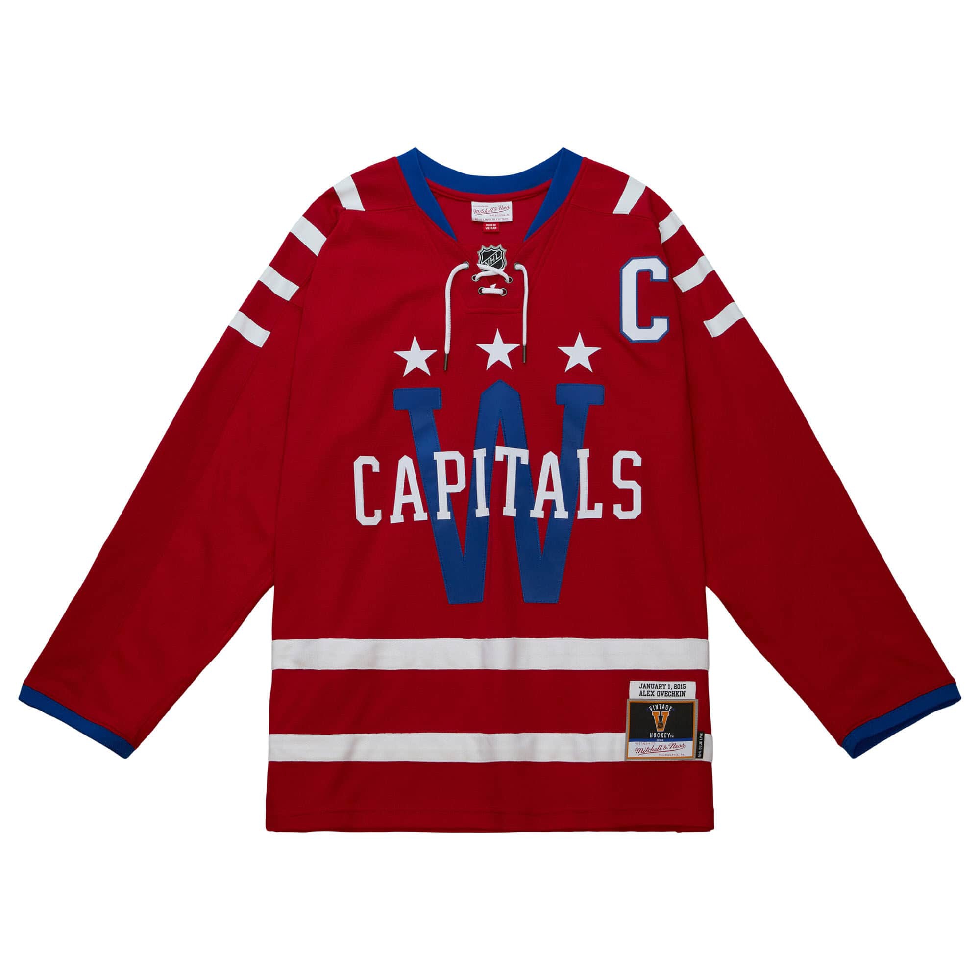 Mitchell & Ness NHL Herren Blue Line Eishockey Trikot von Washington Capitals Superstar Alex Ovechkin im 2015 Winter Classic Design.