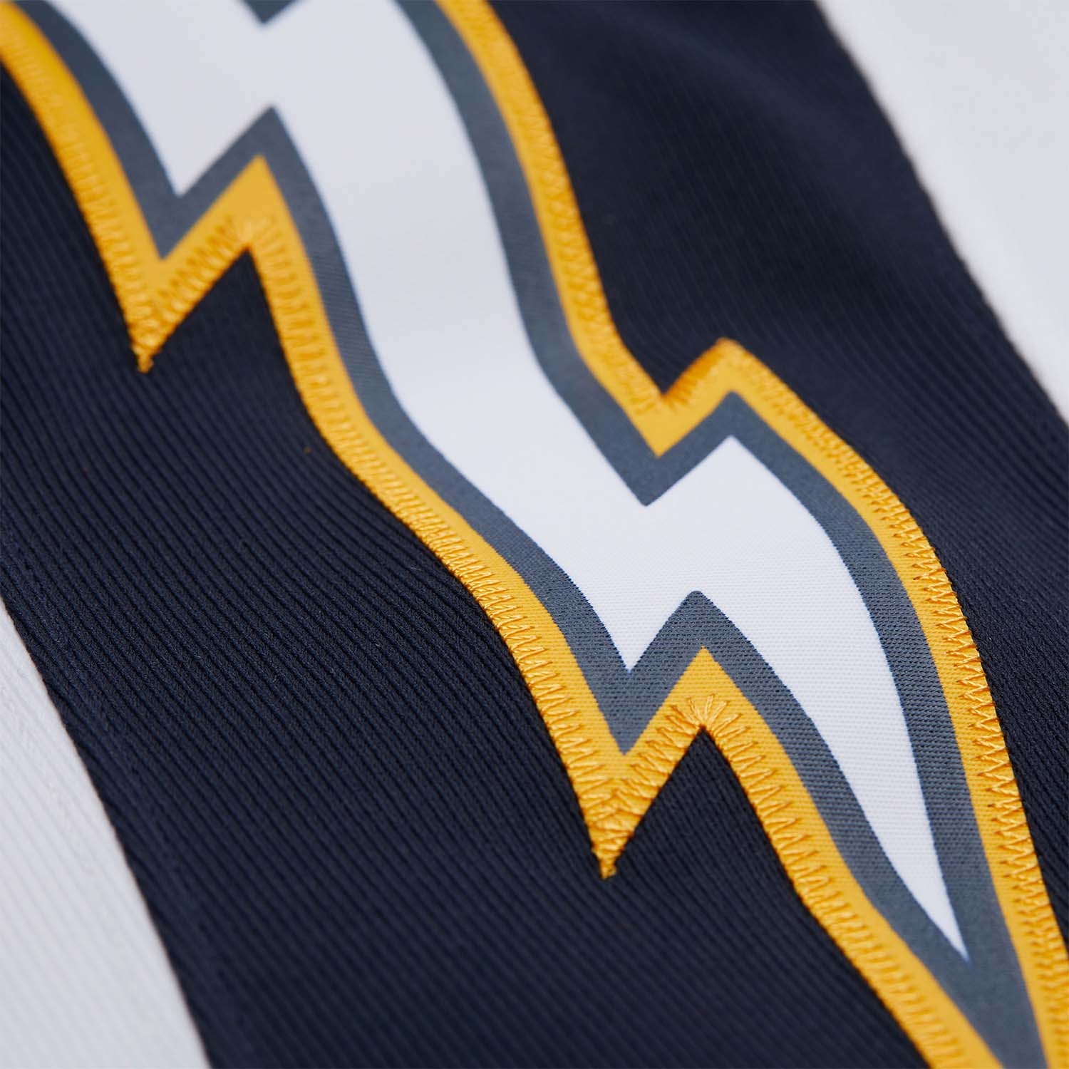 Aufgenähte Nummern, Namenszug, Logos und das ikonische Blitz-Design auf den Ärmeln orientieren sich originalgetreu am NFL-Design der Chargers aus dem Jahr 2006. Das gestickte NFL Shield am Kragen sowie das Mitchell & Ness Legacy Collection Label am Saum garantieren maximale Authentizität.