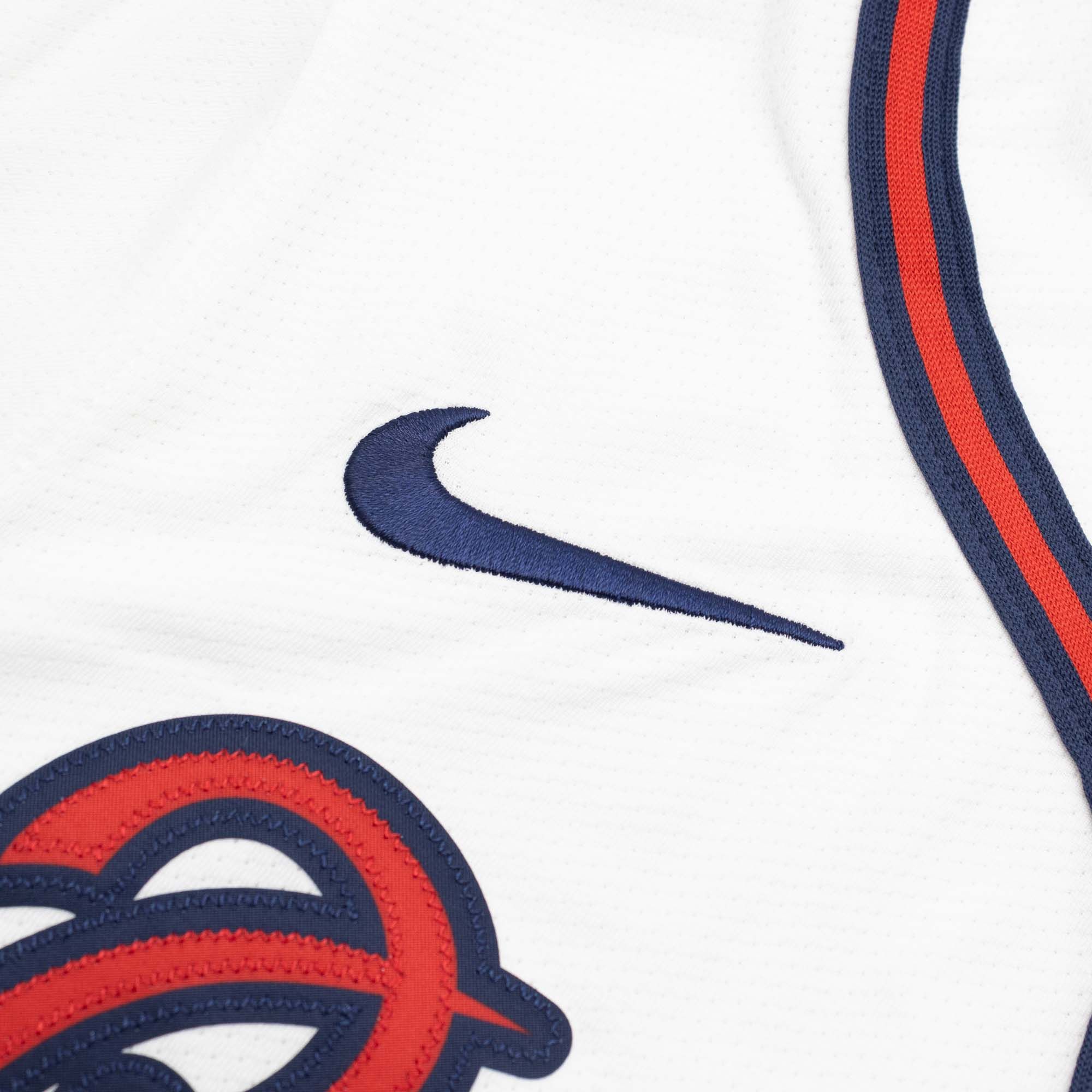Dieses Atlanta Braves Home Trikot ist von den Spieluniformen deiner Lieblings-MLB-Mannschaft inspiriert und bietet einen authentischen Look mit Twill-Details. Das schweißableitende, doppelt gestrickte Mesh-Gewebe sorgt für ein atmungsaktives, angenehmes Tragegefühl am Spieltag. Auf der Vorderseite ist das Atlanta Braves Wordmark als Heat-Sealed Logo mit Zickzack-Nähten aufgebracht. Das Nike Swoosh ist aufgestickt. Die Rückseite ziert das MLB Batterman Logo am Kragen. Am vorderen Saum befindet sich das Nike Jock Tag.