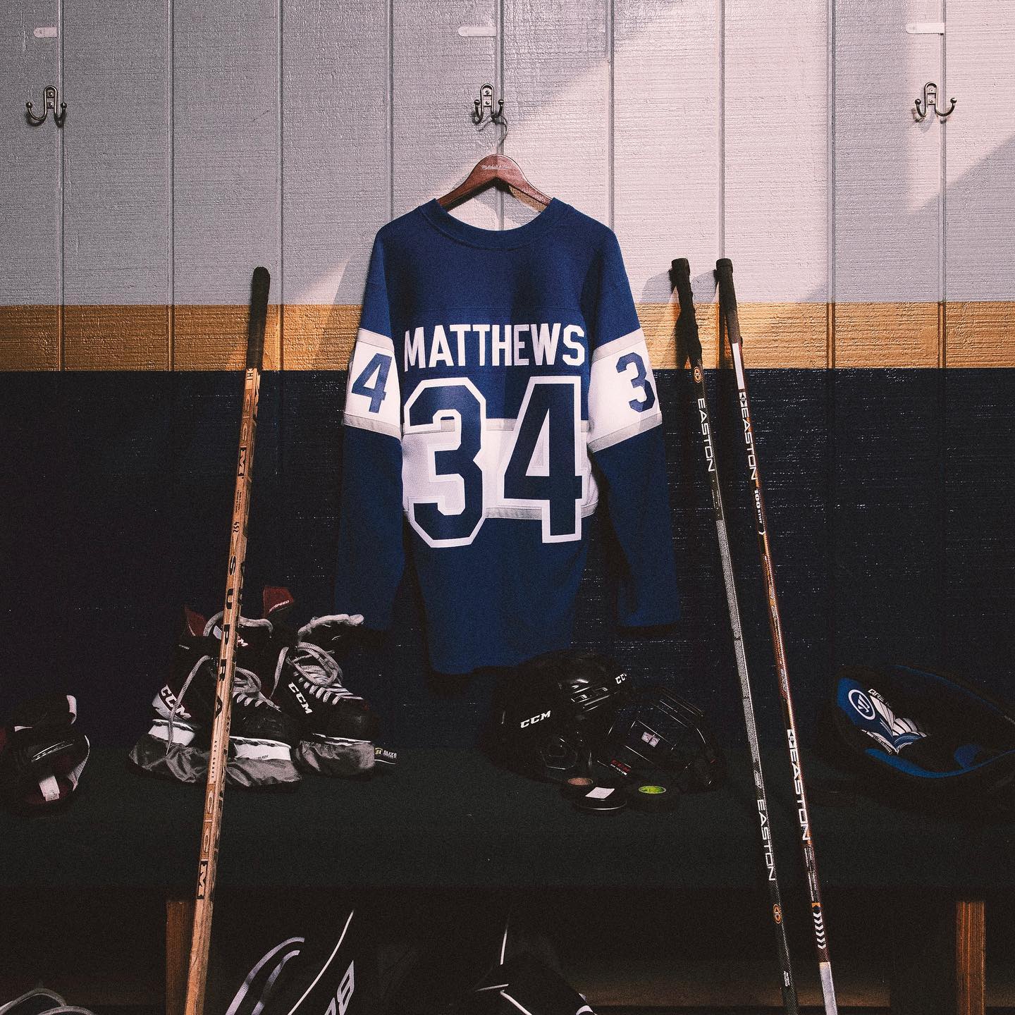 Das Mitchell & Ness Vintage Hockey Label (NHL Blue Line) ist genauso wie der Spielername inklusive Jahrgang am vorderen Saum aufgenäht. Auf der Rückseite sind die Spielernummer 34 und der Spielername MATTHEWS ebenfalls aufgenäht. Abgerundet wird das klassische Design mit den aufgenähten Nummern auf den Ärmeln und dem großen Querstreifen.