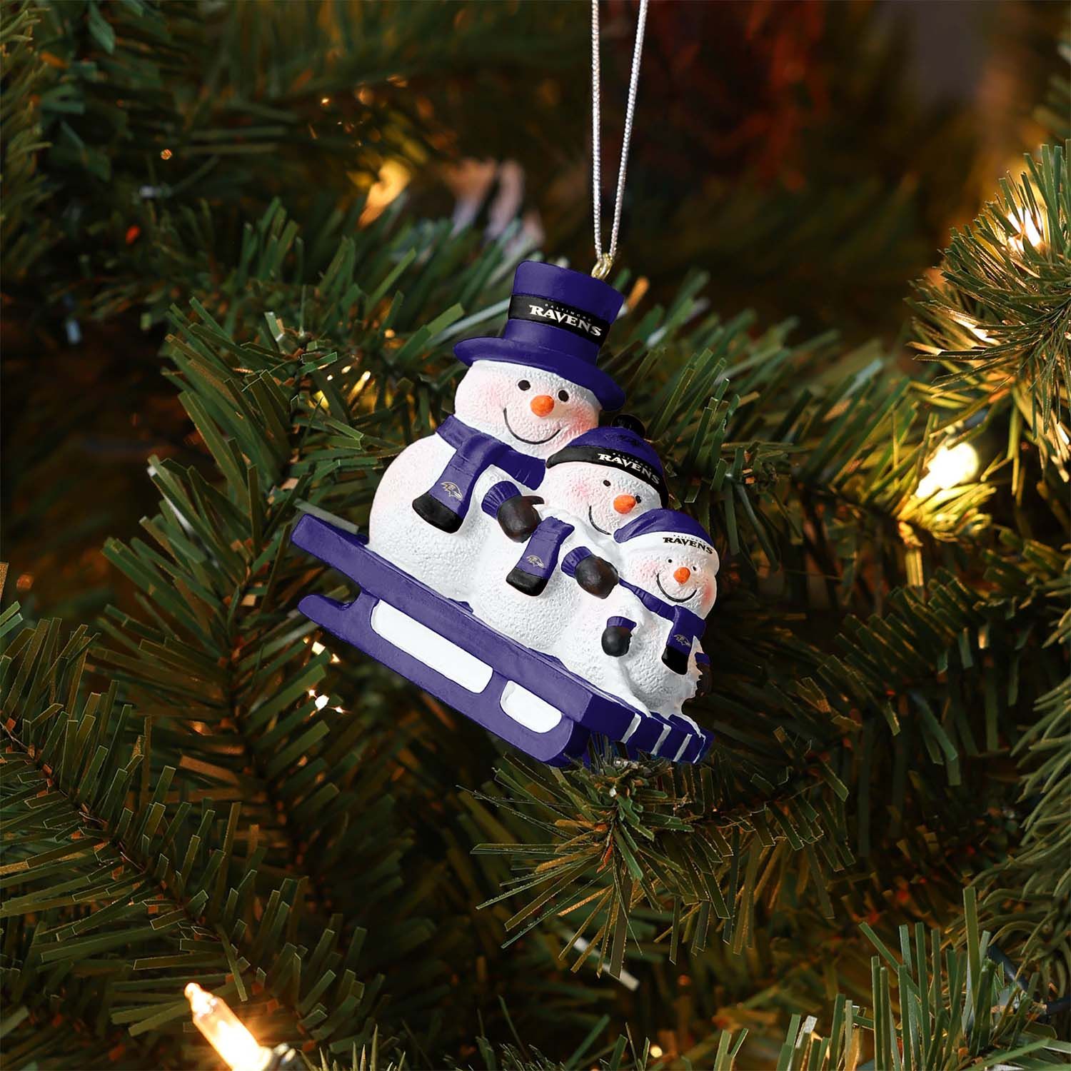 FOCO NFL Christbaumschmuck mit Schneemännern auf einem Schlitten von deinen Baltimore Ravens passend für jeden Weihnachtsbaum.
