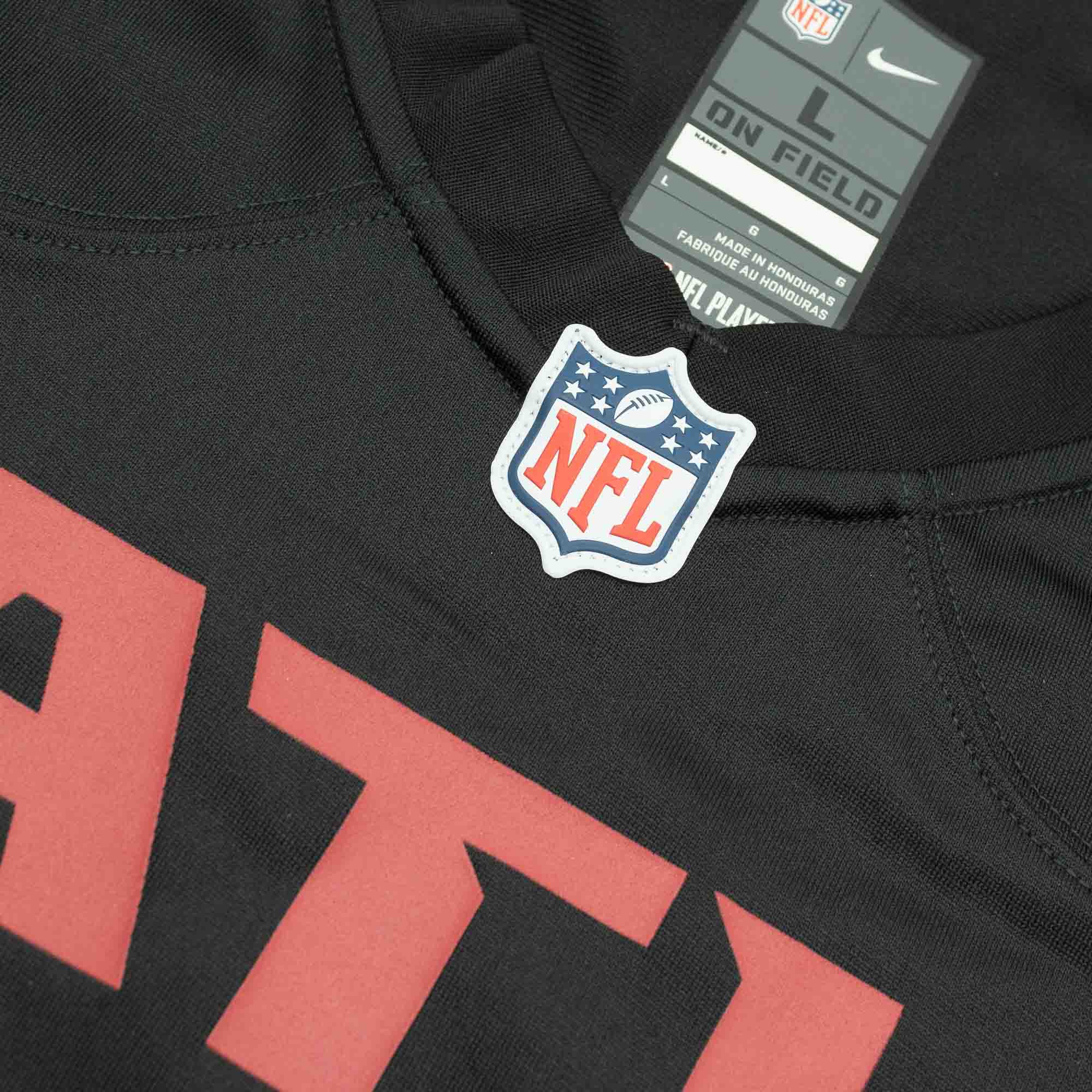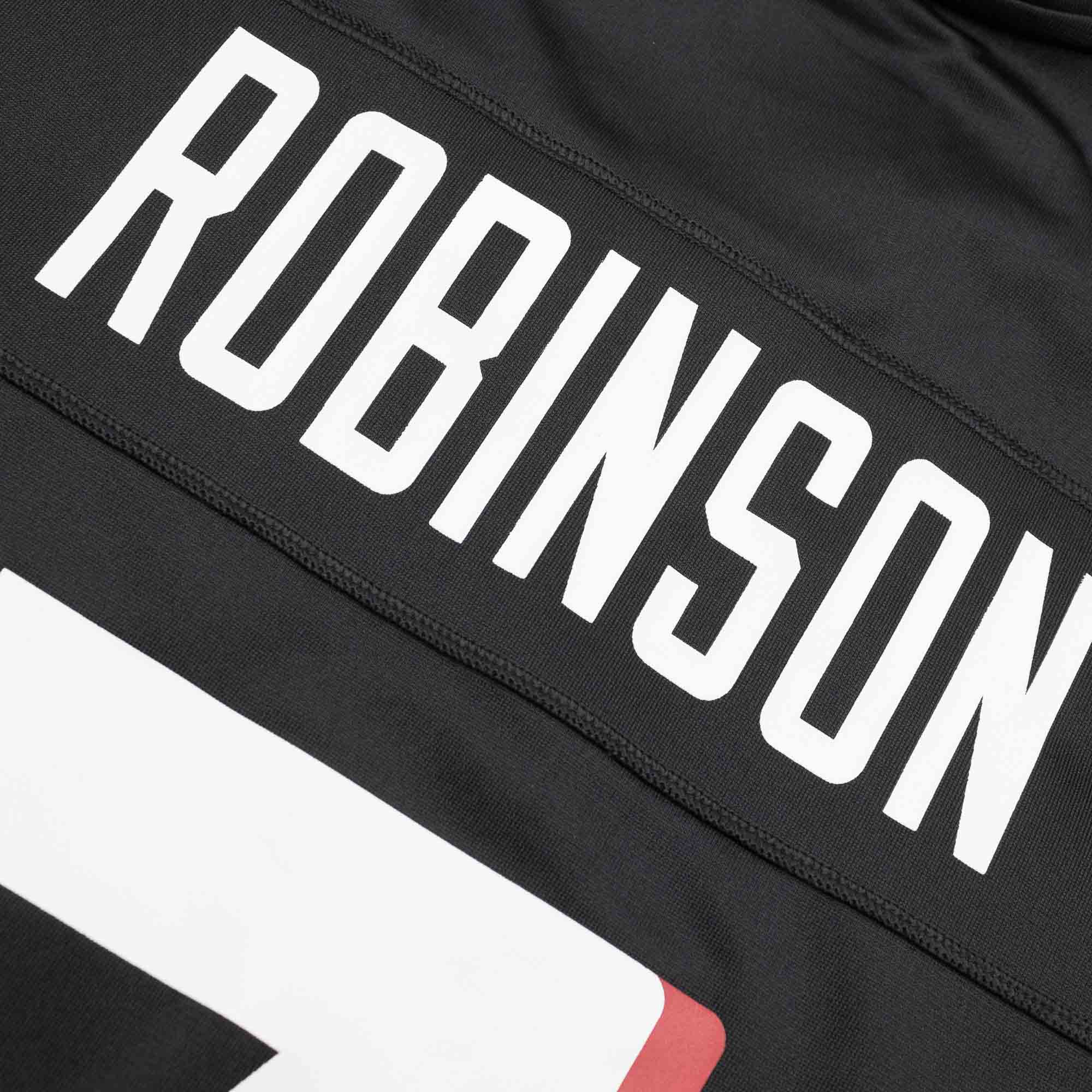 Die Game NFL Trikots sind in hochwertiger Nike-Qualität produziert und sind ein absolutes Must-Have für jeden passionierten American Football Fan. Dieses Atlanta Falcons NFL Fan-Trikot besteht zu 100% aus Performance Polyester mit recycelten Fasern aus der Nike Move to Zero Kollektion. Alle Logos, Ziffern und Buchstaben sind hochwertig aufgedruckt (Screen-Printed) und entsprechen dem offiziellen Design der original NFL-Spieltrikots. Das Trikot hat die Nummer 7 und den Spielernamen ROBINSON aufgedruckt, das Nameplate ist sogar extra aufgenäht. Das NFL-Shield am Kragen ist genauso wie das Equipment-Label am Saum aufgenäht.