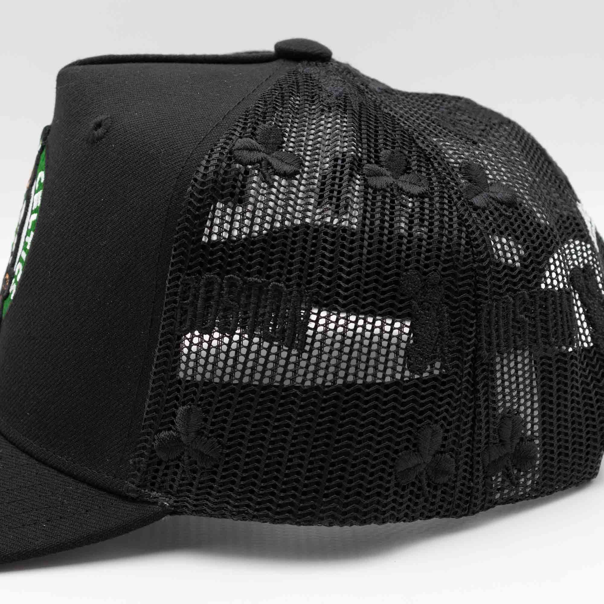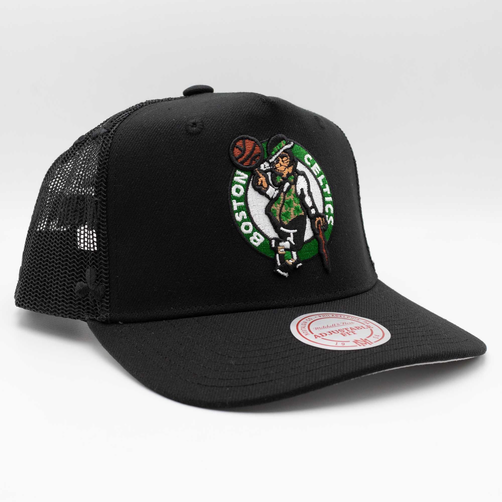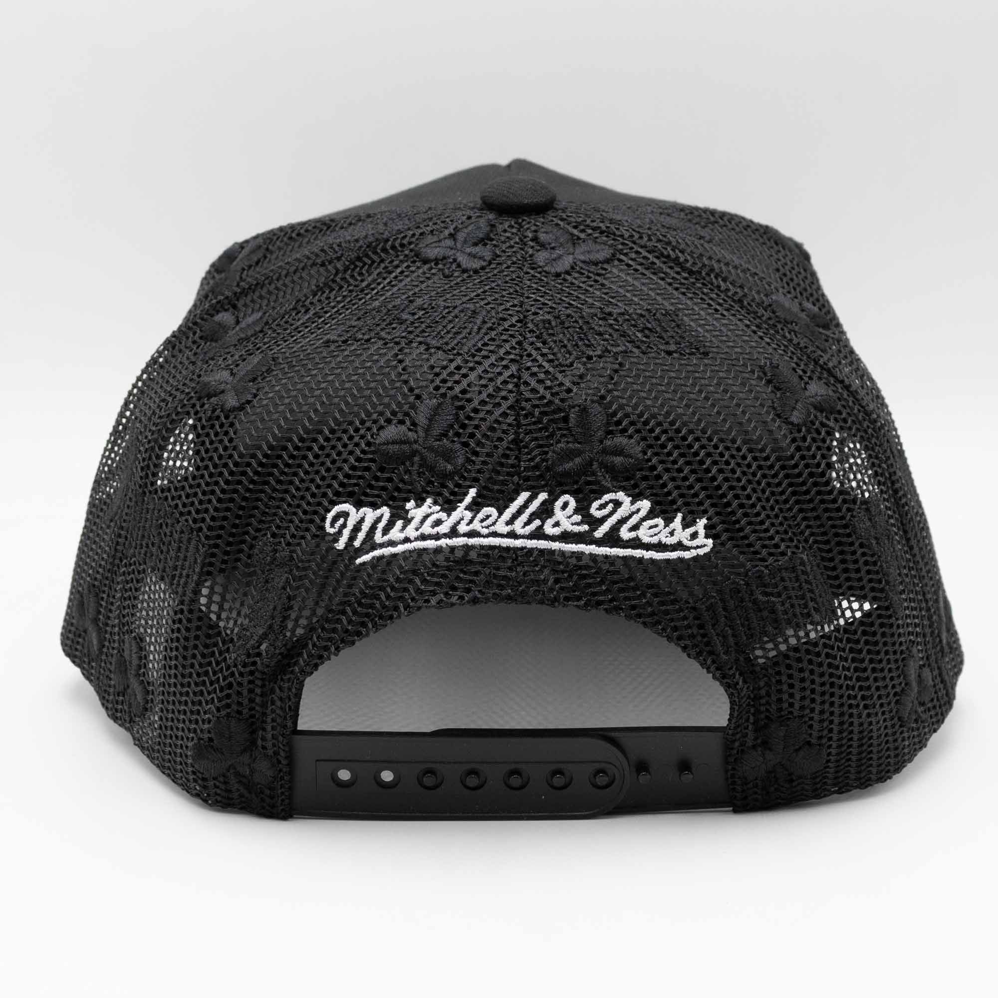 Mitchell & Ness NBA Adjustable Fit Trucker Cap von deinen Boston Celtics im schwarzen Monogram Style.