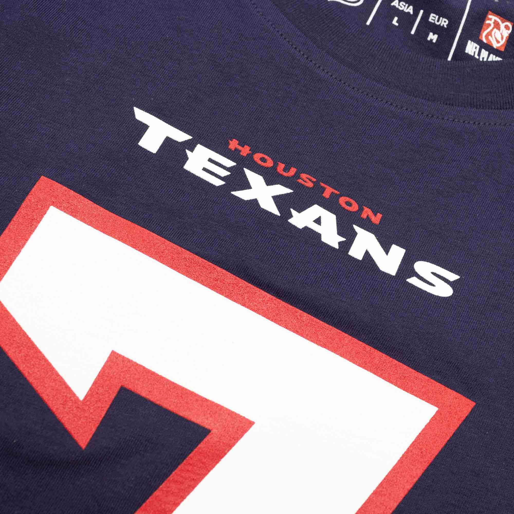 Durch den originalgetreuen Druck der Ziffern und Buchstaben entsteht der eindeutige NFL-Jersey-Look. Als kleines Extra ist auf der Vorderseite zusätzlich das Houston Texans Wordmark Logo über der Nummer aufgedruckt.