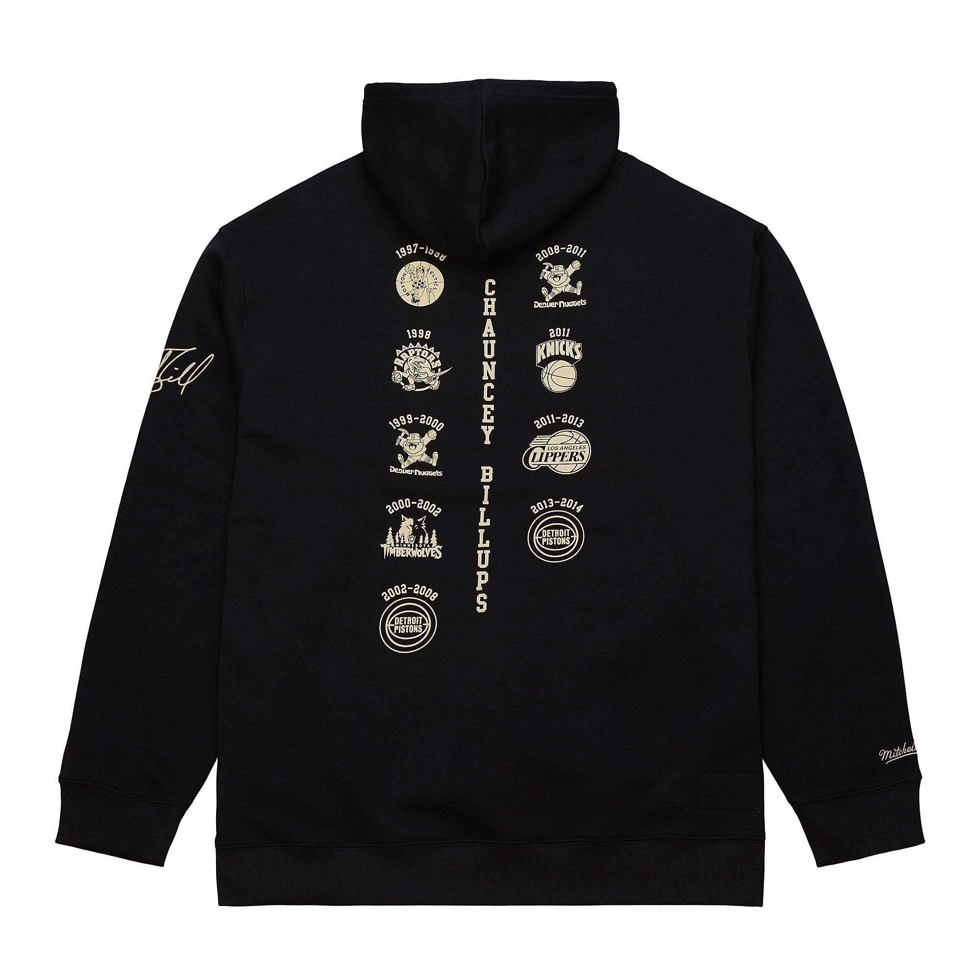 - Karriere-Highlights: Die Rückseite des Hoodies zeigt eine detaillierte Grafik mit den Teams und Jahren, in denen Chauncey Billups gespielt hat, und macht den Hoodie zu einer Hommage an seine gesamte Karriere.