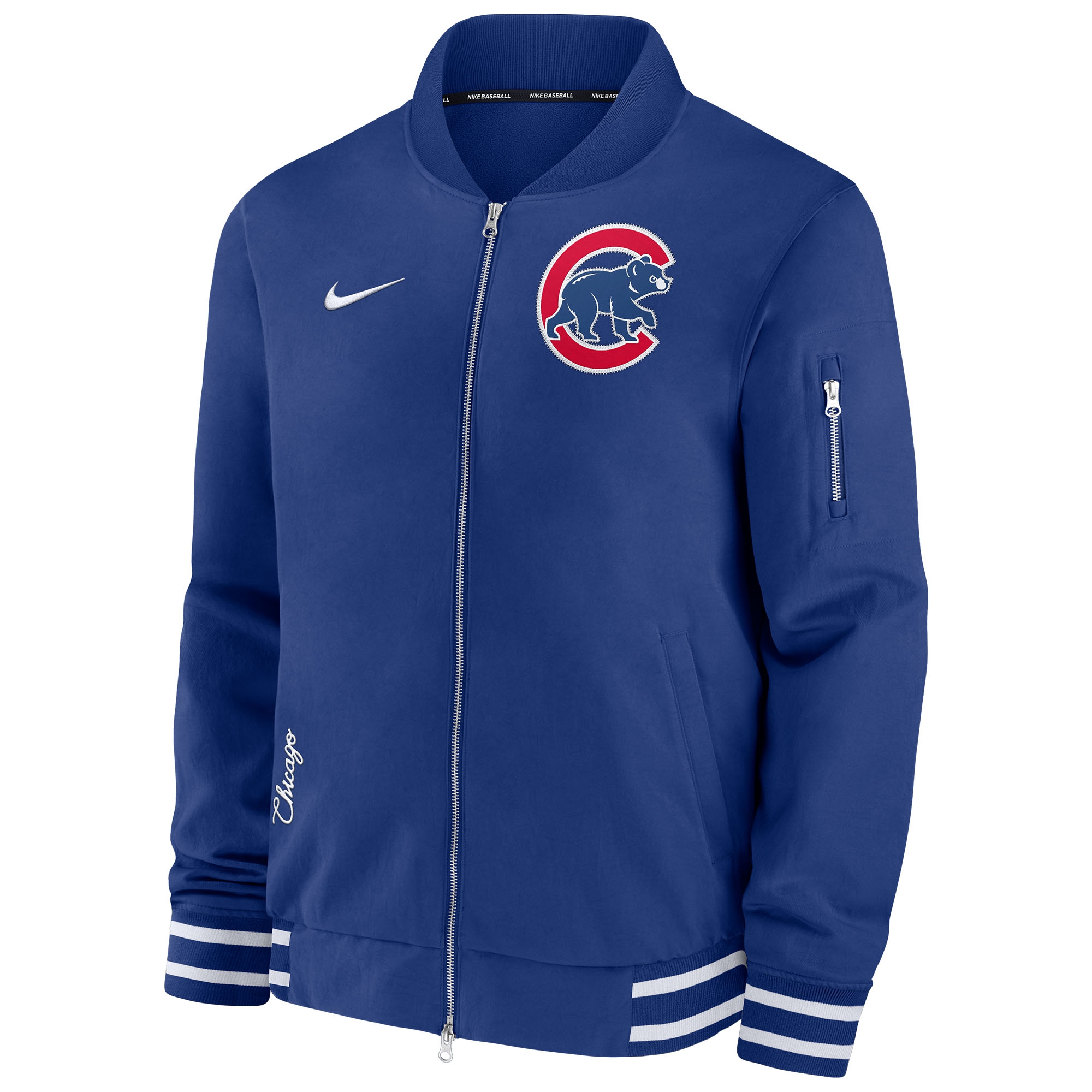 Nike Baseball Herren Bomber Jacke von deinen Chicago Cubs aus der offiziellen 2024 MLB Authentic Collection.