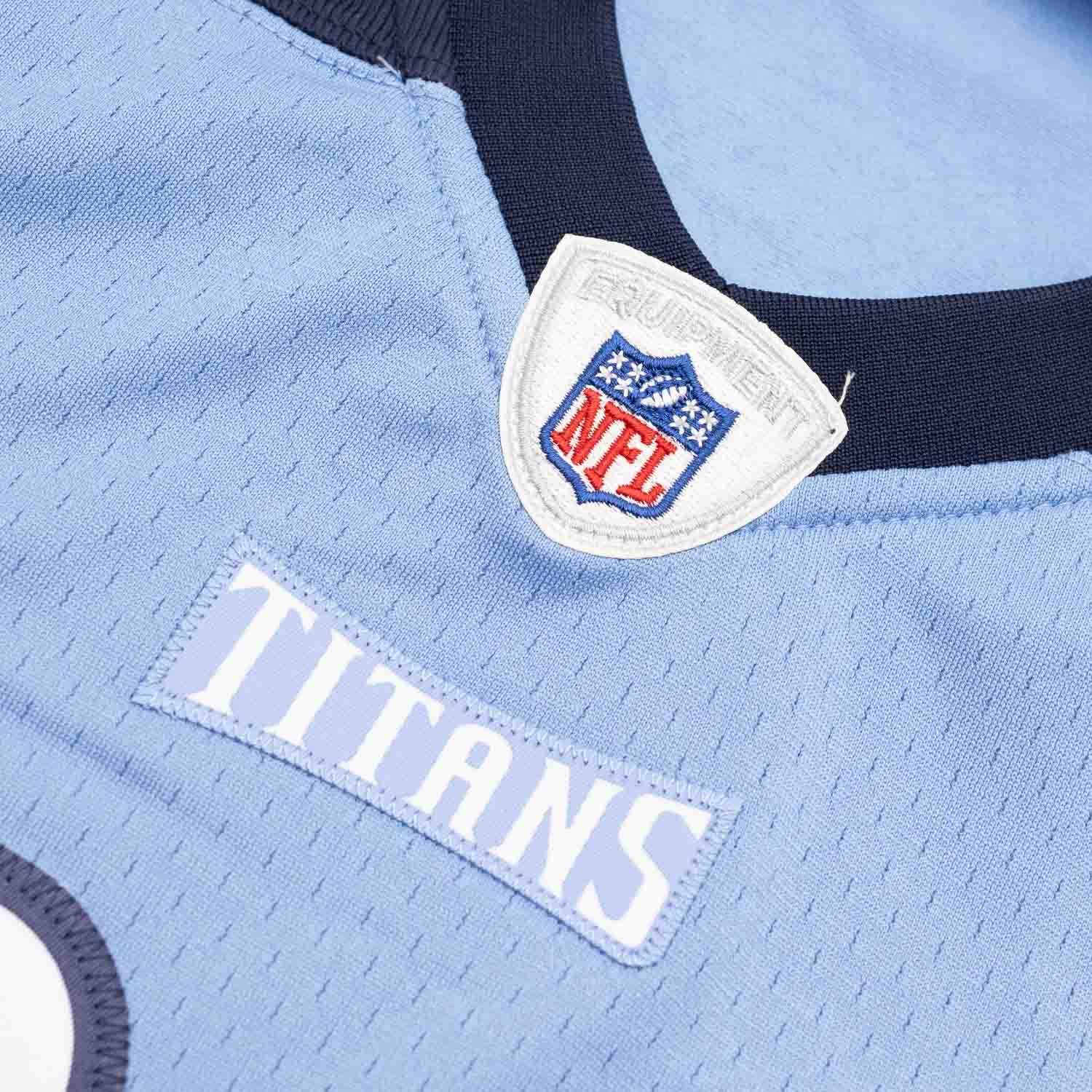 Alle Zahlen und Buchstaben sind hochwertig aufgenäht - die Ärmelstreifen sind aufgedruckt - und entsprechen dem offiziellen NFL-Design der damaligen Tennessee Titans Trikots (2009). Das NFL-Shield am Kragen ist genauso wie das NFL-Mitchell & Ness Label (Legacy Collection) am Saum aufgenäht.