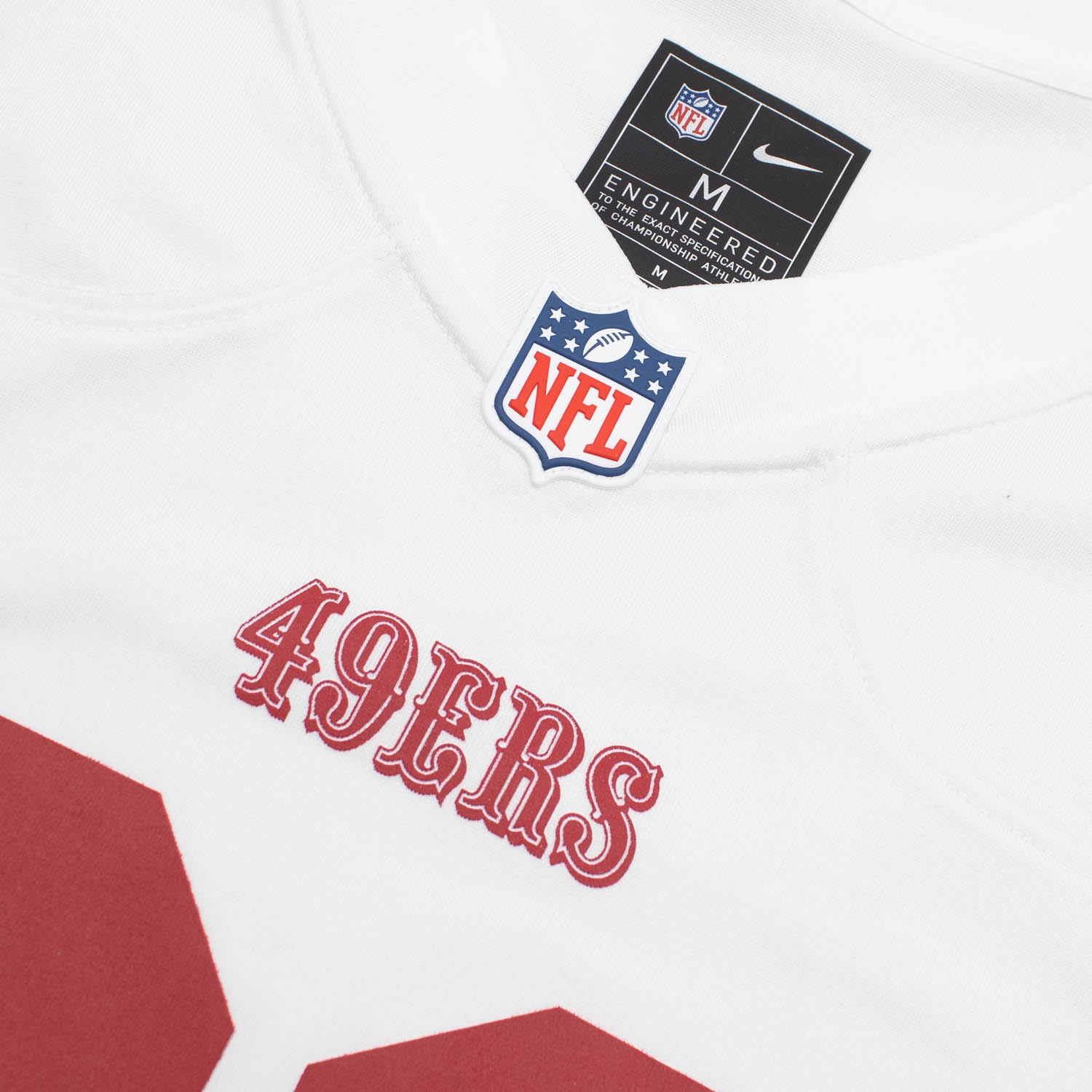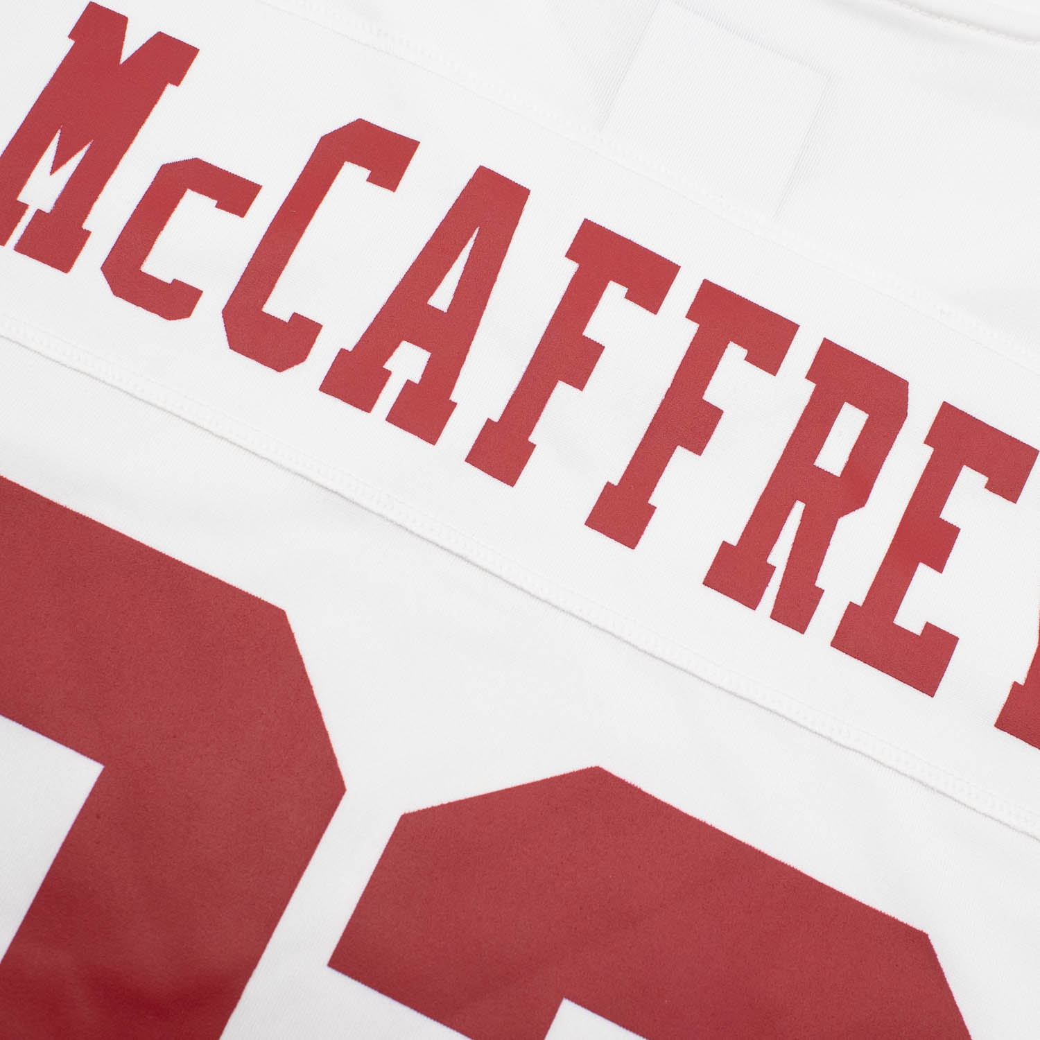 Nike NFL Herren American Football Trikot von San Francisco 49ers Running Back Christian McCaffrey im weißen Game Style.