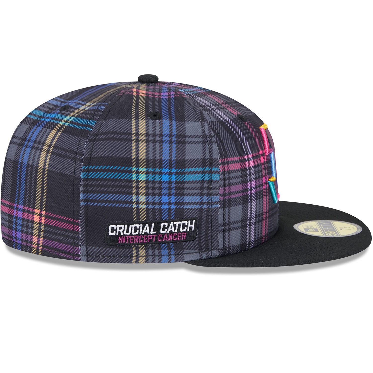Unterstütze den weltweiten Kampf gegen Krebs mit der offiziellen New Era 2024 NFL Crucial Catch On-Field Kappe. Diese geschlossene NFL Cap wird während der 2024-25 Crucial Catch Kampagne im Oktober an den NFL-Seitenlinien getragen. Die Cap ist auf der Vorderseite hochwertig mit dem bunt abgesetzten Cincinnati Bengals Teamlogo bestickt. Die rechte Capseite ist mit dem CRUCIAL CATCH - INTERCEPT CANCER Patch bestickt. Die Rückseite ziert das aufgestickte NFL Logo. Das Sublimierte Karo-Design auf allen sechs Panels in den typischen Crucial Catch Farben sorgt für einen einzigartigen Look.