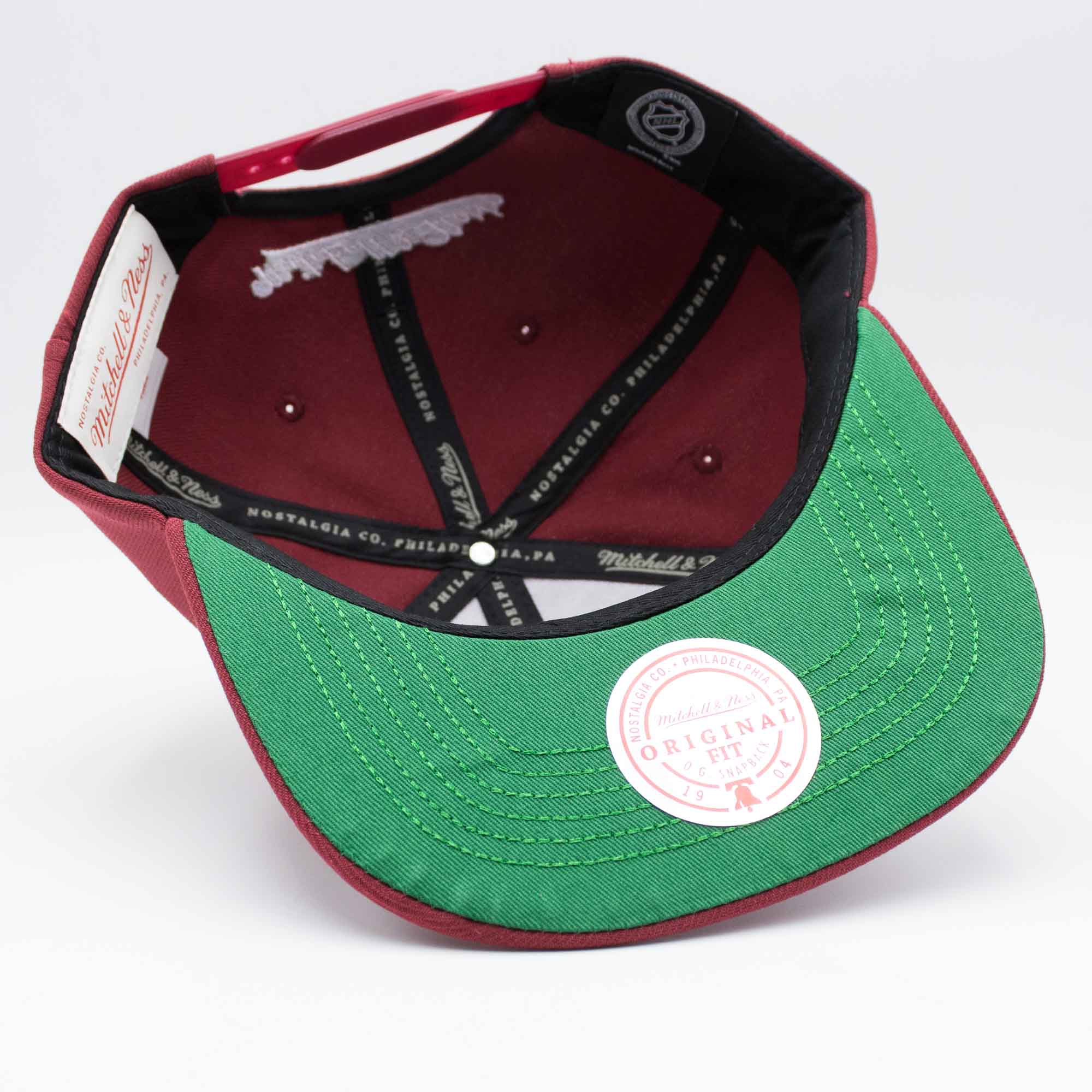 Klassische Mitchell & Ness Original Fit Snapback mit schlanken, flachen Schirm und hoher, fester Krone. Für mehr Atmungsaktivität sorgen die gestickten Ösen; das innenseitige Schweißband erhöht den Tragekomfort. Den flachen Capschirm kannst du nach Belieben in die gewünschte Form biegen.