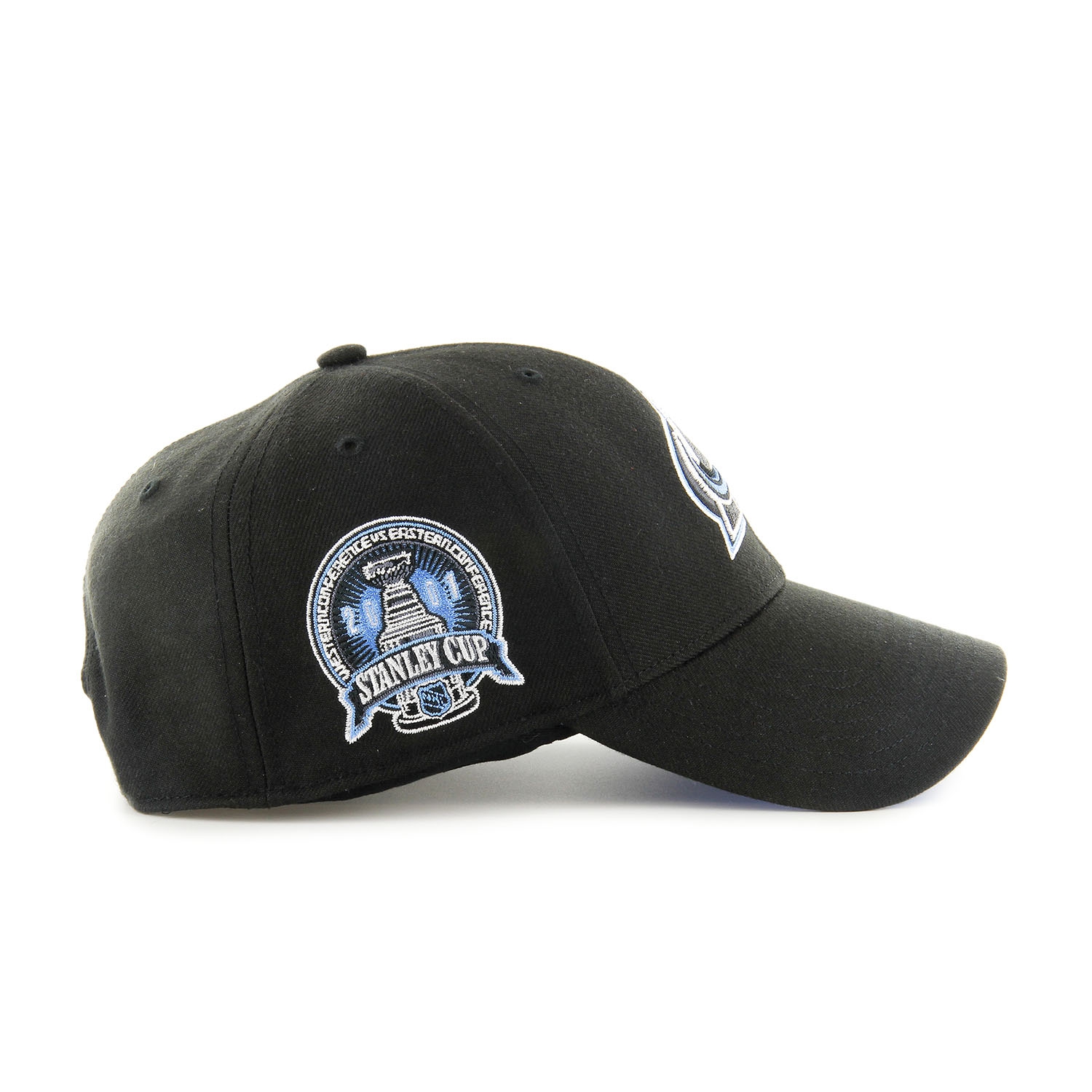 Diese schwarze '47 Eishockey Cap ist ein Must-Have für jeden Fan des klassischen Eishockeys. Auf der Cap-Vorderseite ist das Teamlogo im 3D-Design aufgestickt, die rechte Capseite ist mit dem Stanley Cup 2001 Patch bestickt. Die Schirmunterseite ist blau.