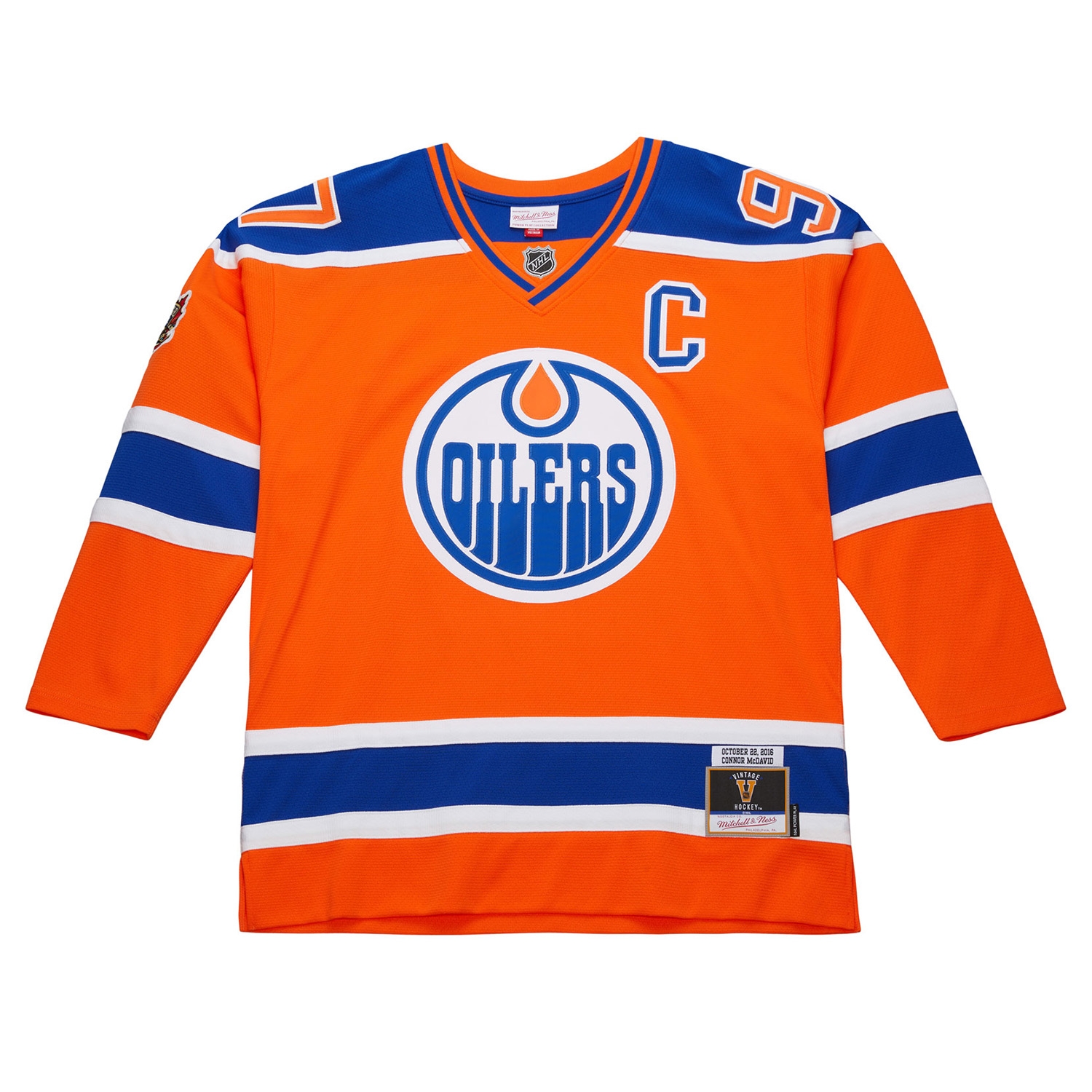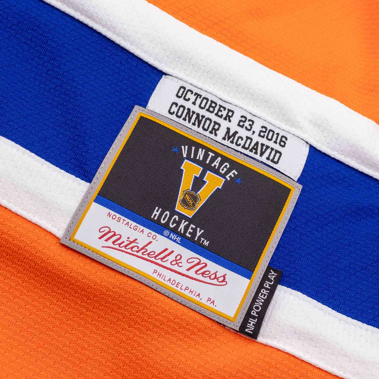 Mitchell & Ness NHL Herren Power Play Eishockey Trikot von Edmonton Oilers Superstar Connor McDavid im 2016 Heritage Classic Design.