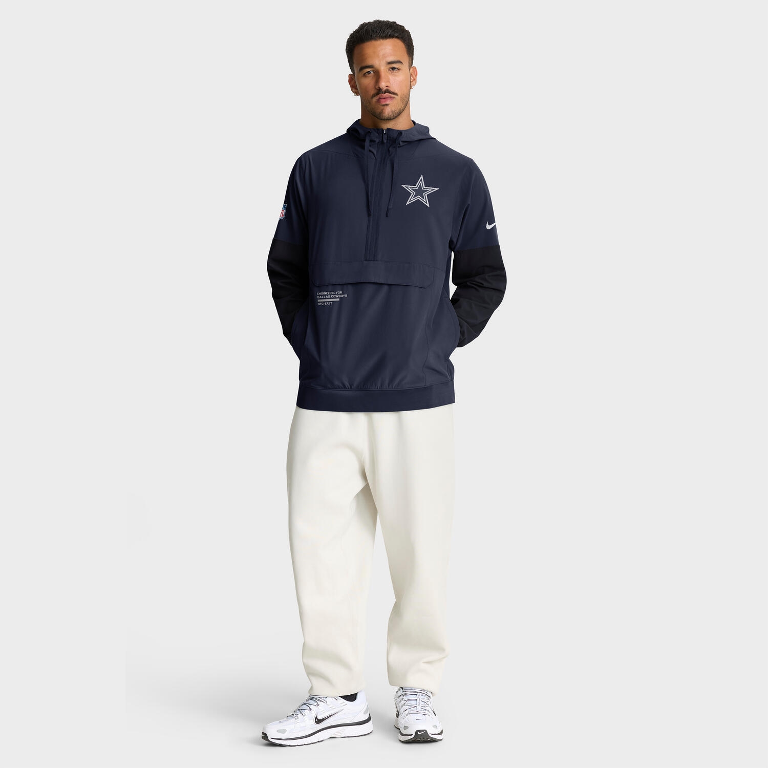 Offizieller NFL Sideline Anorak der Dallas Cowboys aus der 2025 On-Field Kollektion von Nike - identisch mit dem Modell, das von Spielern und Coaches an der Seitenlinie getragen wird. Diese moderne 1/2-Zip Jacke überzeugt durch wetterfestes Material, sportlichen Schnitt und authentische Teamdetails - der perfekte Begleiter für alle, die auch bei unbeständigem Wetter vollen Fanstolz zeigen wollen.