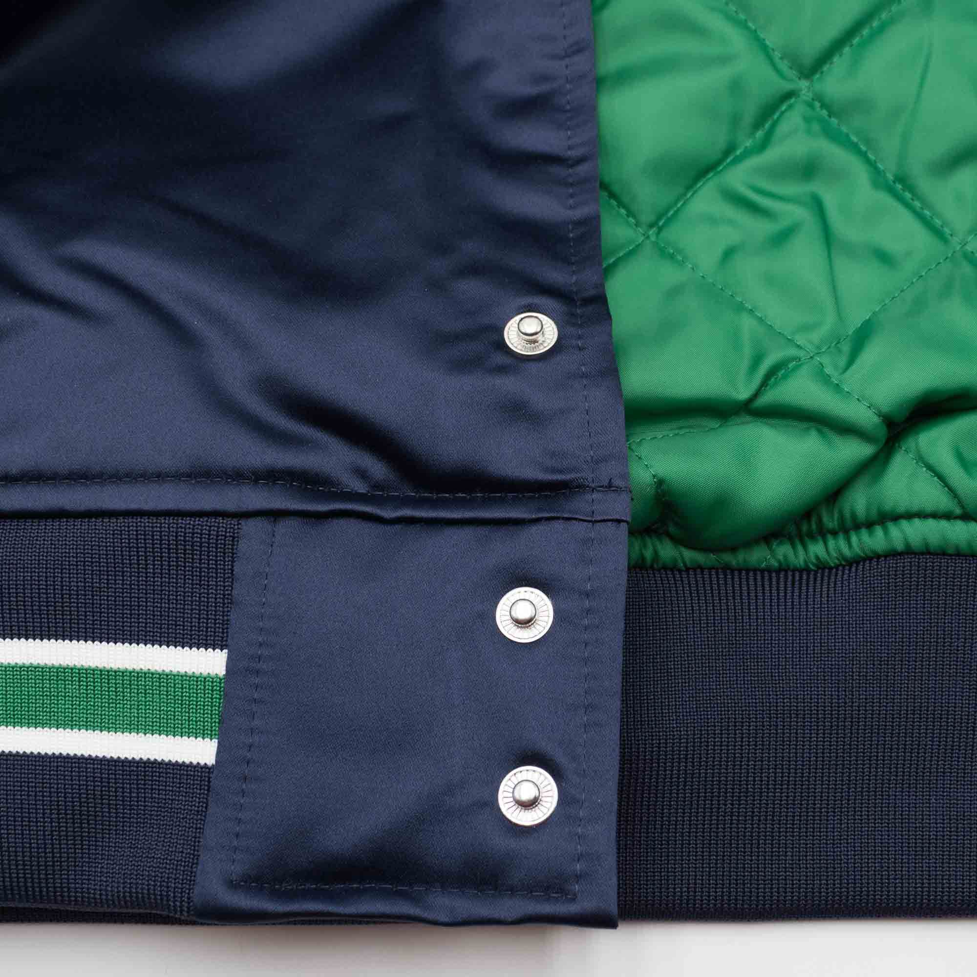 Diese Mitchell and Ness Premium NBA Jacke mit klassischer Satin-Außenhülle aus der Hardwood Classics Kollektion bringt mit dem Dallas Mavericks Teamdesign deinen Support auf die Straße. Das mittelschwere Futter sorgt auch an kalten Tagen für eine angenehme Wärmeisolierung, die elastischen Strickbünde am Kragen, am Bund und an den Ärmelenden sorgen für den absoluten Retro-Look. Die NBA Jacke hat zwei äußere Taschen, eine Innentasche und eine durchgehende Knopfleiste. Das Design ist den amerikanischen College und High School Jacken nachempfunden und macht mit dem glänzenden Satin-Look modisch richtig was her.