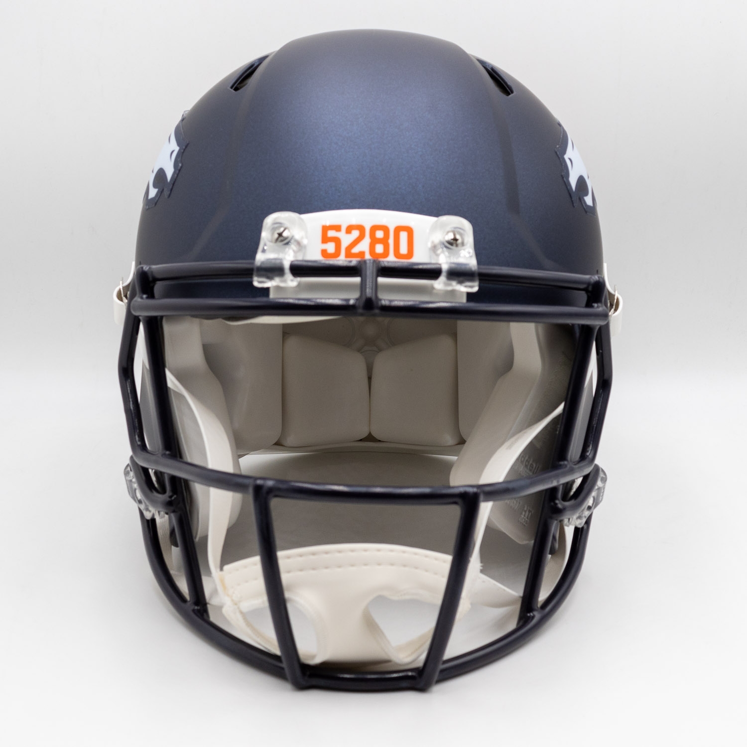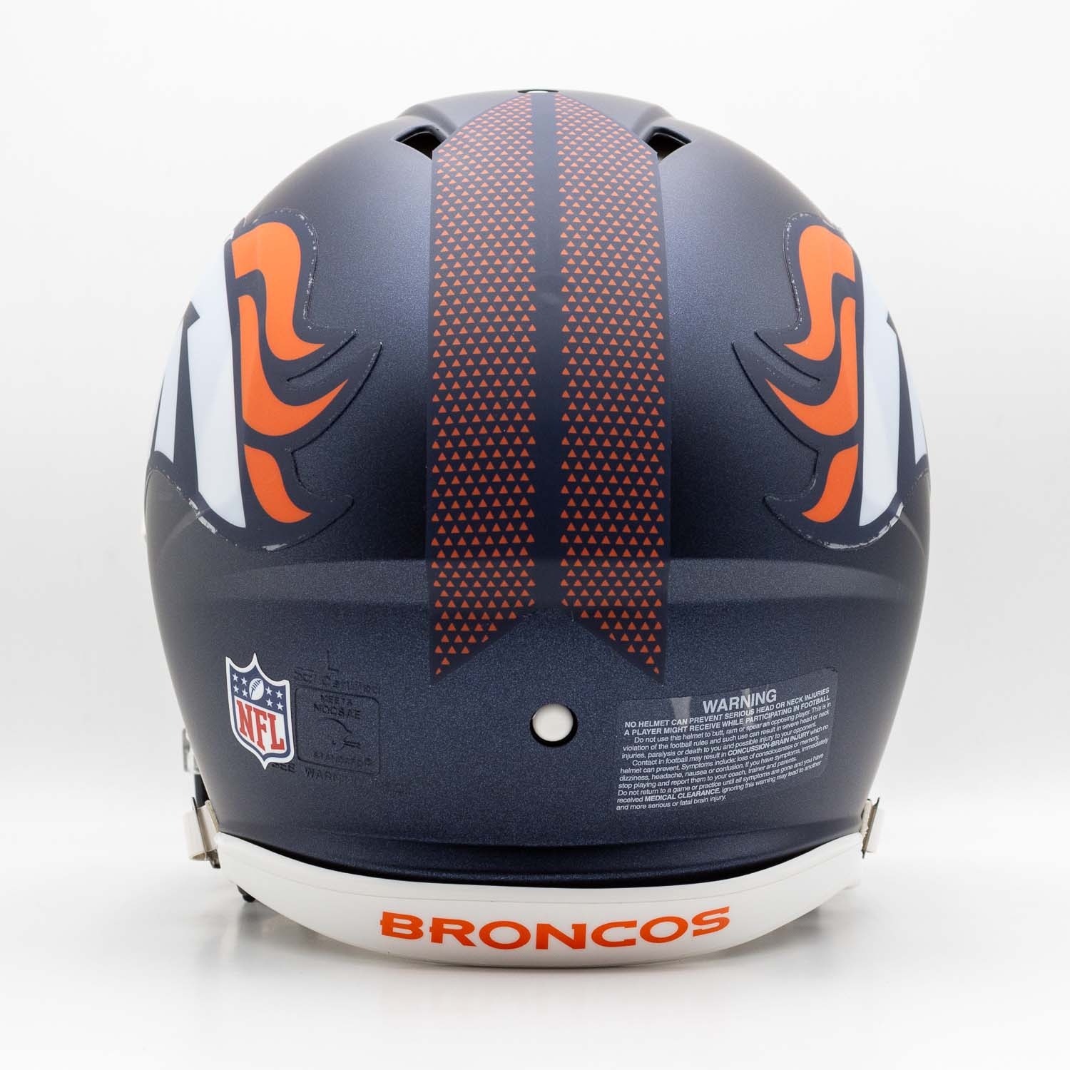 Die große Speed-Shell, das charakteristische S2BD-SW-SP-Gesichtsgitter und der robuste 4-Punkt-Kinnriemen spiegeln das Design wider, das Profis verwenden. Die offiziellen Teamfarben und Logos der Denver Broncos sind präzise aufgeklebt, was den Helm zu einem herausragenden Sammlerstück macht - perfekt auch für Autogramme.