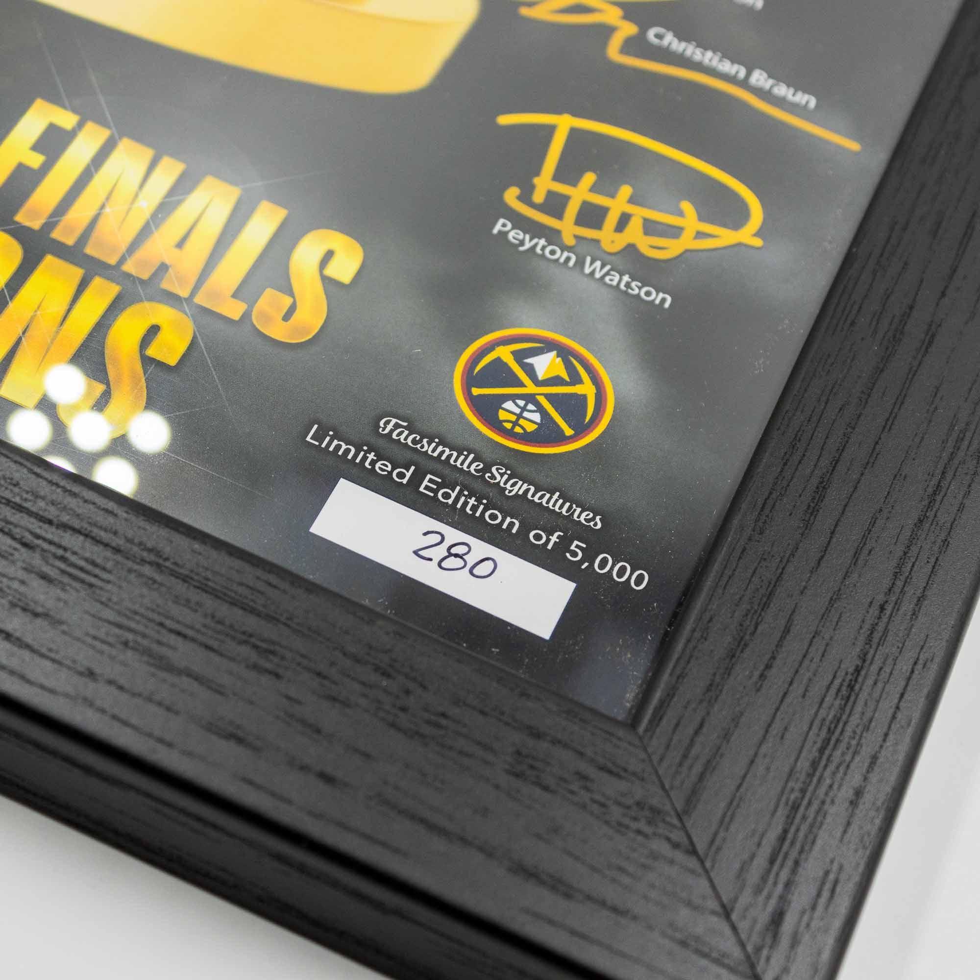 Highland Mint gerahmtes Denver Nuggets 2023 NBA Champions Trophy Bild mit den gedruckten Signaturen der Spieler.
