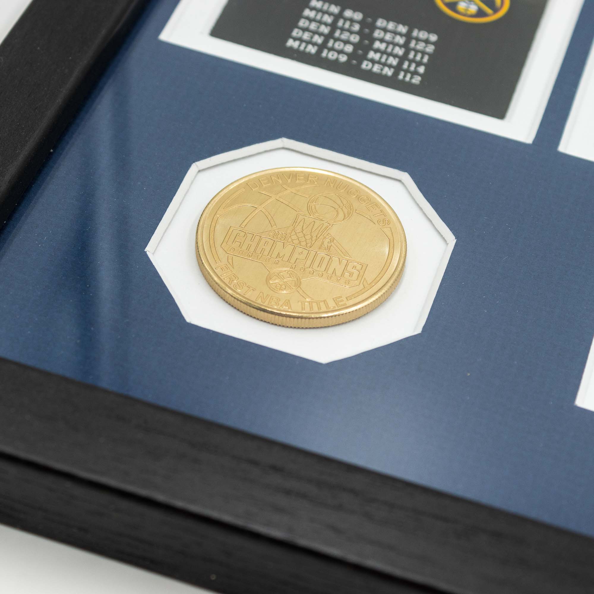 Highland Mint gerahmtes 2023 NBA Champions: Denver Nuggets Playoffs Tickets Bild mit zwei Bronzemünzen.